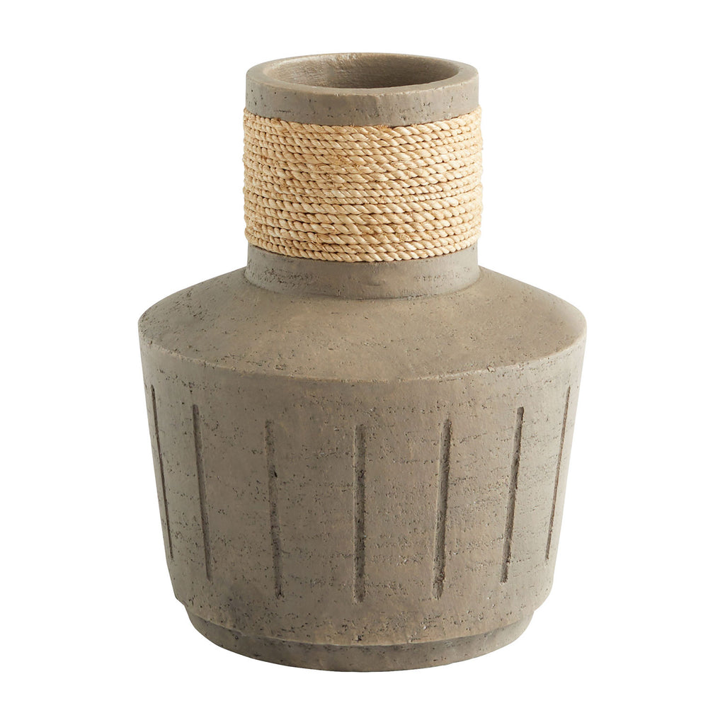 The Cyan Design Hydria collection of natural rubbed taupe earthenware gains its name from the Greek word meaning water. A jute rope collar is hand applied to the narrow neck that transitions dramatically to a wide body, mimicking the classic vessel Grecian women would use to fetch fresh water. Deep parallel grooves are carved along the sides for an added hint of texture. Display the Hydria collection in a neutral color palette in any living area, dining or conversation room. Available in two sizes.
