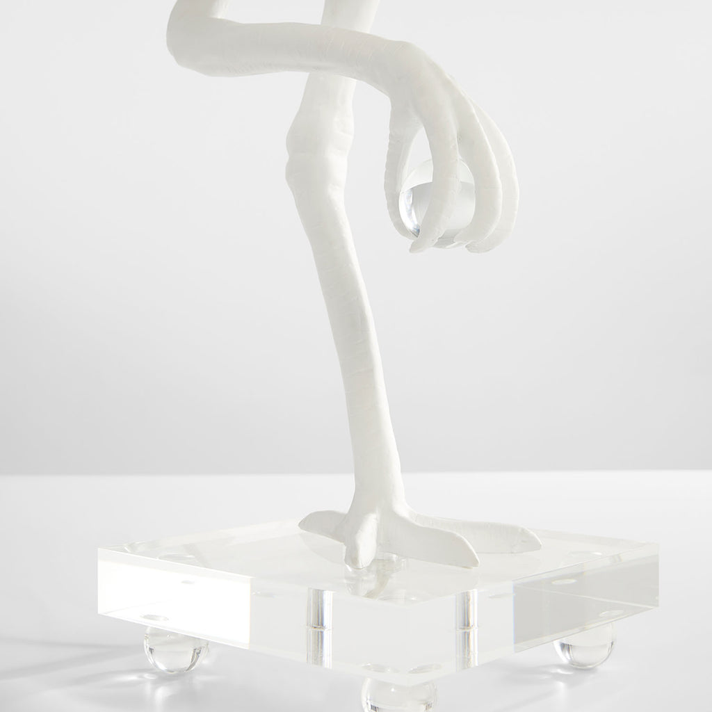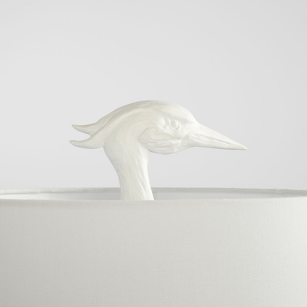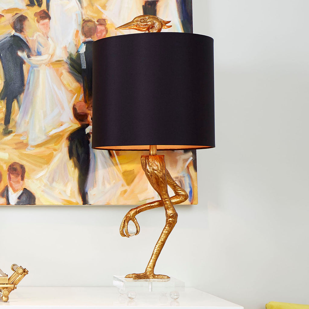 A long-legged ibis is the stunning centerpiece of this decorative table lamp. Beautiful in any space, this lamp features a warm ancient gold/ silver leaf finish over detailed resin construction. A black satin drum shade is lined in gold/silver, ensuring inviting illumination for a favorite sitting area. This charming bird holds a crystal sphere in its talon, and rests on a acrylic base that delivers a touch of luxurious flair. ul>