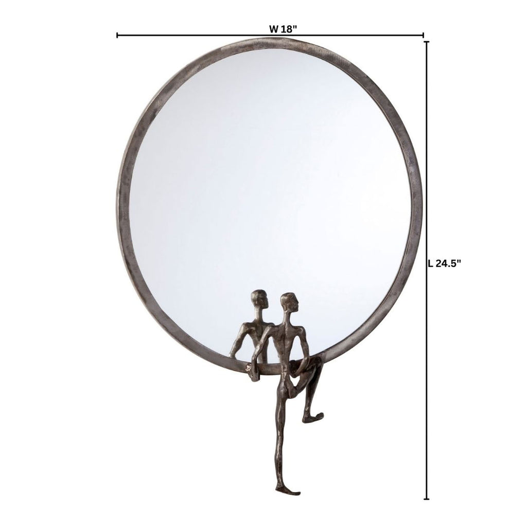 Functional minimalist design meets the decorative in this raw steel mirror, great in any living room or industrial home office. A detailed iron sculpture in the form of a human hangs from the geometric silhouette, creating an interesting visual.
