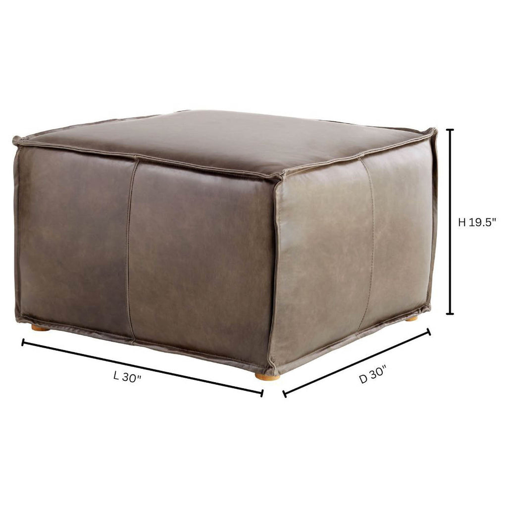 The leather Lusso poufs are constructed of soft, durable grey leather with hints of deep brown undertones. Ideal for seating or used as informal tables, these poufs are the epitome of casual luxuriousness. Foam cushions provide lasting comfort wrapped in a natural hide with a half-inch flange along the seams.