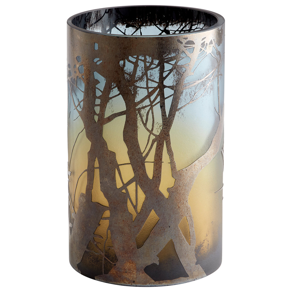 This cylindrical vase is an ode to a mid-autumn sunset, sporting a stunning silhouette of a barren tree, contrasted with an evocative evening sky. The blue and amber glass forms into a nicely scaled tabletop accent, perfect for any modern inspired styling or vibrant bohemian leaning ensemble. Place this impervious vase with fresh cut flowers near a window for a radiantly mesmerizing effect.