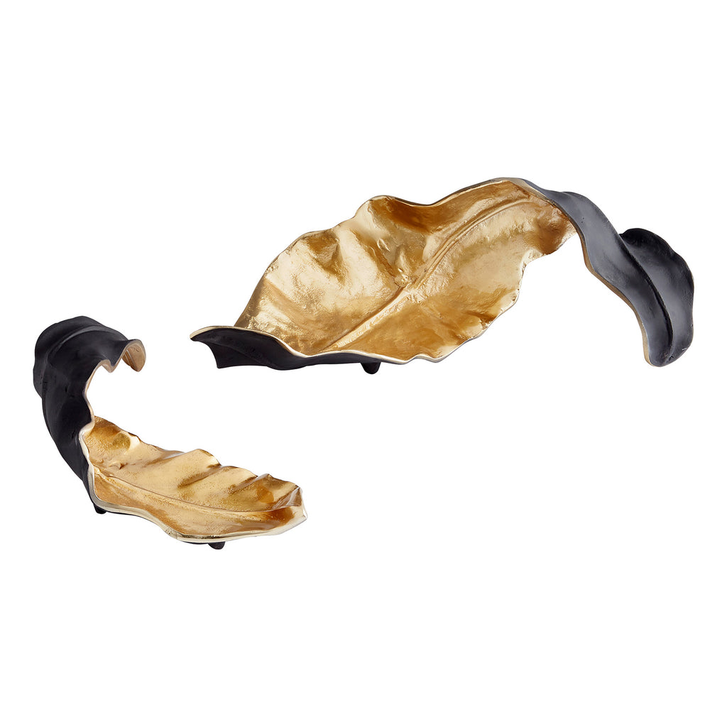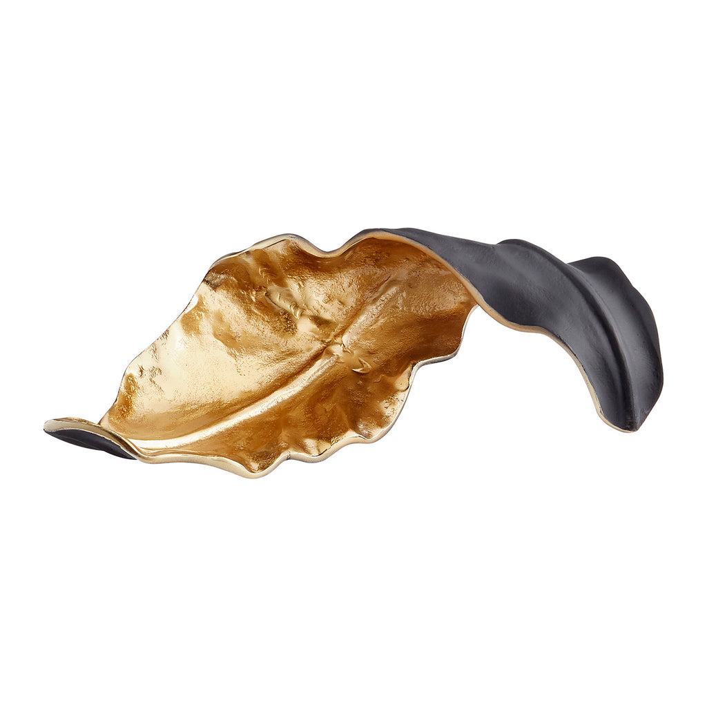 A beautiful way to add texture to a coffee or dining table, the Cyan Design Oak Brush tray is an artful addition to any ensemble. Crafted in lightweight aluminum, this platter features exceptional detail, creating a sense of realism in its resembles to a curling fall leaf. Two-toned Matte Black and Gold finishes are a subtle component to transitional or contemporary decor.