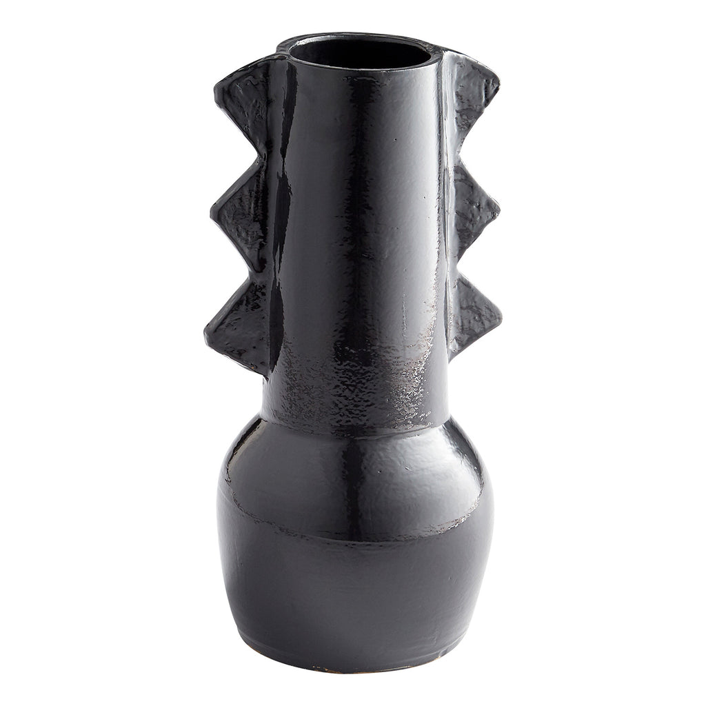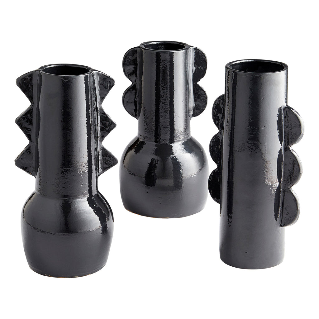 This artisan crafted terracotta vase collection features a rustic glazed Black finish, with an abstract form influenced by ancient Native American pottery. A cylindrical design with a muted totem pole design, the Cyan Design Potteri vase collection is the perfect addition to any subdued organic ensemble, or boho-chic arrangement. Potteri collection vases shown are sold separately.