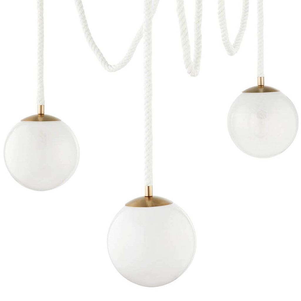 The magic of the Rockport Collection lies in the delicate, wispy, white, and smoky details that gracefully form swirling patterns inside milky glass spheres. These intricate designs capture the essence of the coastal breeze, offering a captivating and whimsical ambiance. Each fixture within this collection is a work of art, with no two alike, showcasing the exquisite craftsmanship and attention to detail. The aged brass canopy and fittings lend an air of vintage charm, while heavy white cotton rope in nautical braids extends gracefully from the glass sphere before it is fixed by an aged brass cleat hitch. The Rockport 3 Light pendant comes with 3 aged brass hook for hanging. Additional Rockport Hooks are available for purchase.