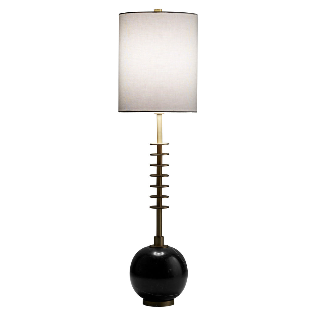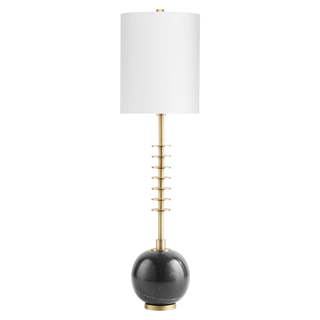 Abstract, portable, & compact, a beautiful table lamp keeps your space illuminated in style. This accent light, the Cyan Design Sheridan lamp, is a uniquely shaped table lamp made of iron in a stunning, aged brass finish, coupled with a black marble base. This luminary is topped with a clean white drum shade, making it a great fit in any space! Designed for Cyan Design by J. Kent Martin.