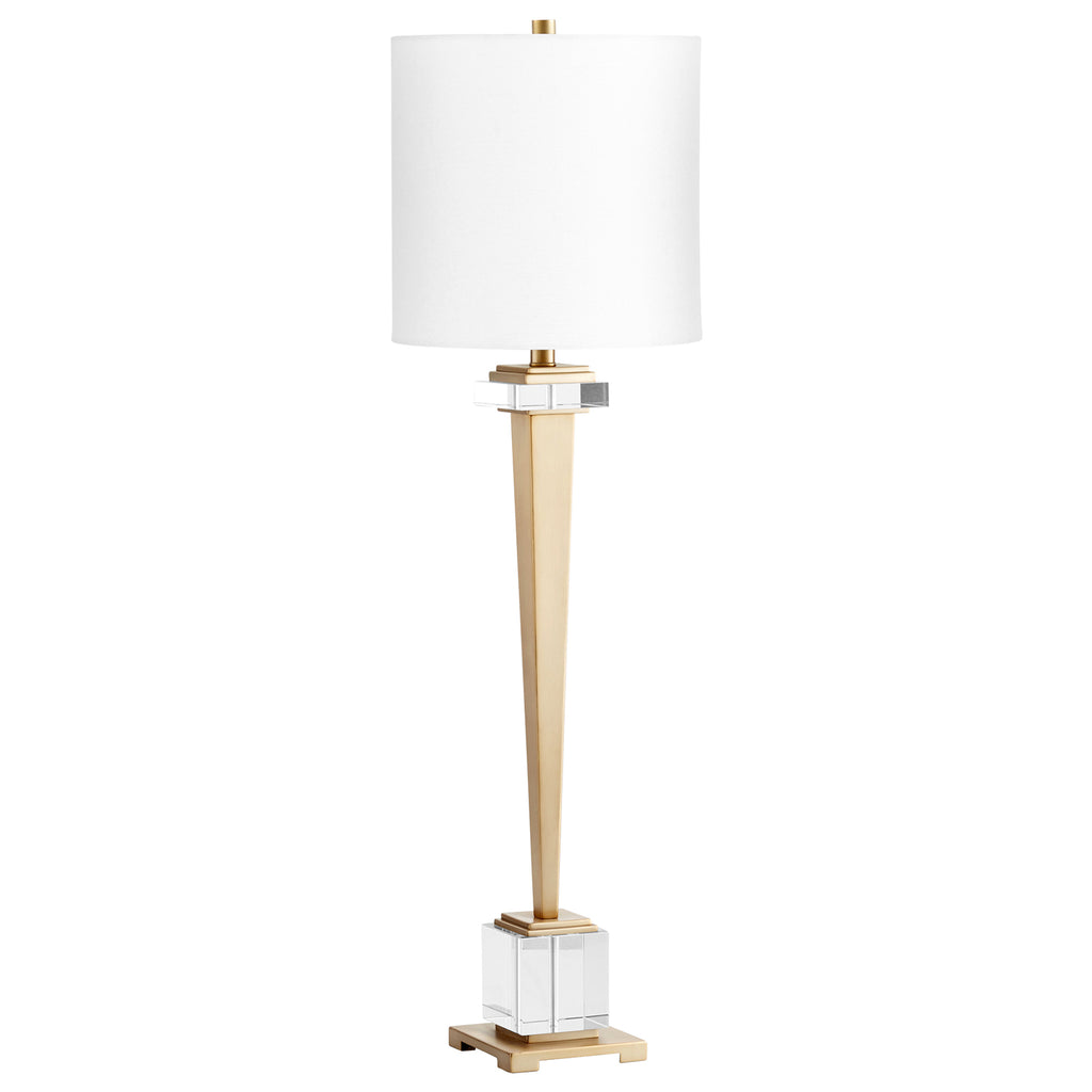 Designed for Cyan Design by J. Kent Martin. Sleek and slender, the Statuette table lamp mixes crystal accents with a stunning brass finish to enhance any decor style. The tapered V-shape silhouette descends into a tiered, square base. Incorporate this piece’s industrial appeal by adding it to your living room or entryway ensemble. The one-light, three-way socket design, coupled with a crisp linen shade, makes the Statuette table lamp a perfect option for illuminating any space, home, or commercial.