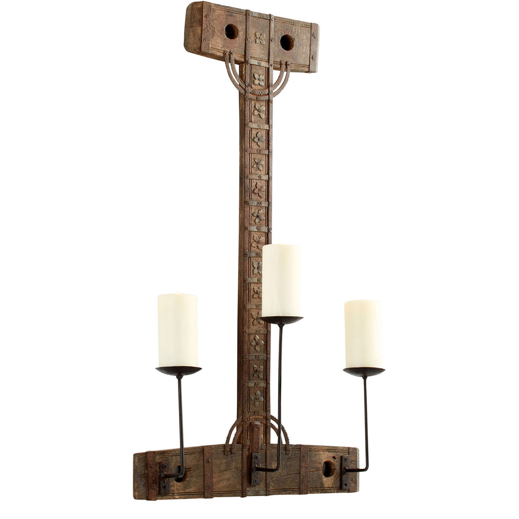 Dive head first into a rustic design motif centered around this iron and wood wall candleholder. In a rustic finish, the holder boasts a grand wall piece with three petite candleholders to ensure a warm and welcoming glow.