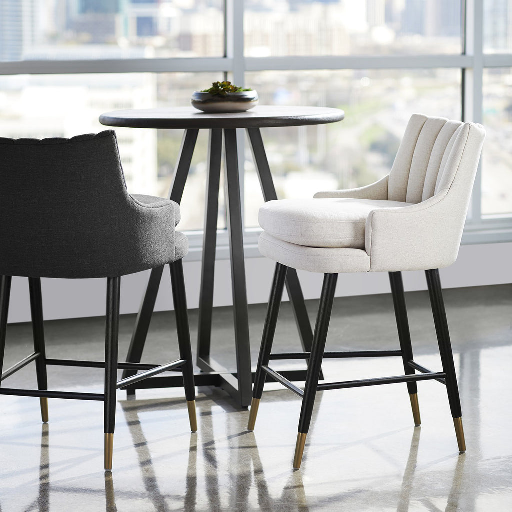 Whether drawn up to a kitchen island, to nestle into a breakfast nook, or giving your entertaining space a handy perch, the Cyan Design Tesoro bar stools are a versatile seating solution that can be worked in throughout your home. Featuring a black wooden base with sleek golden accents, this full-backed stool is capped with foam-filled upholstery for an inviting seat in any space. The seat is available in a Black or Cream option, and boasts a higher than usual elevation, perfect for your countertop bar needs in any modern, eclectic, or mid-mod space.