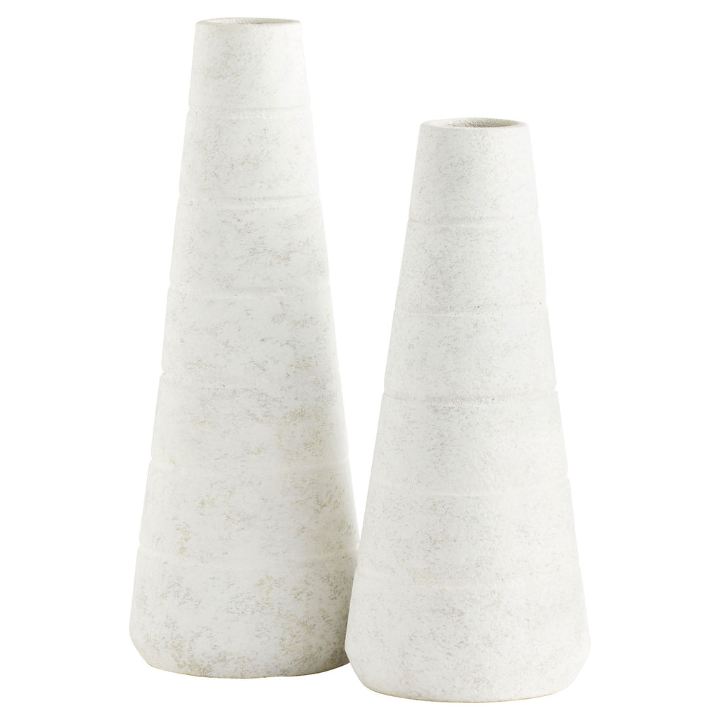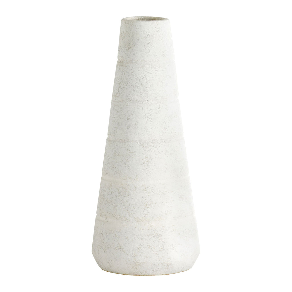 Thera, the ancient name for the volcanic island of Santorini, Greece, was influential in the design of this collection of cone-shaped earthenware vases. The Cyan Design Thera collection features a medium-width base tapers to a slender rim with horizontal lines etched along the sides. A textured finish is applied, giving the series a concrete-like exterior. Display together or individually in any poolside covered patio design, kitchen, entryway or washroom. Available in two sizes and colorways.