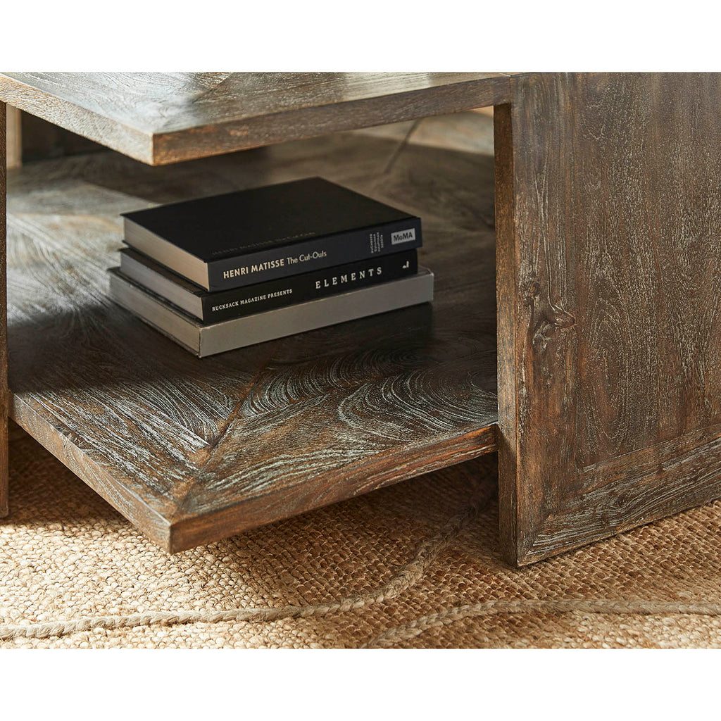 The Alta Table is a striking testament to the beauty of heavily cerused mango wood. This exquisite wood finish unveils the intricate grain of the coffee bean-colored wood, creating an alluring and captivating aesthetic. The vertical side panels, which seamlessly wrap around to the table’s top and meet at the precisely mitered center, exhibit meticulous attention to detail and exceptional craftsmanship. The full lower shelf offers ample space for storage, ensuring that this piece not only adds beauty to your space but also serves a practical purpose.
