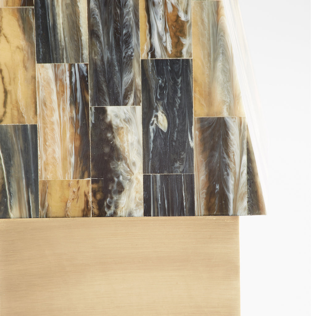 Cairo, or “victorious city,” is the home of last remaining site of the Seven Wonders of the Ancient World, the Great Pyramid. Inspired by the timeless form of the pyramid, the Cairo Spire is hand-crafted and assembled from a mosaic of multi-colored geometric pieces meticulously cut from faux horn. Brass cladding and hand-applied miniature nails support the sculpture on the tip and base. Each piece is a unique display of variations in color.