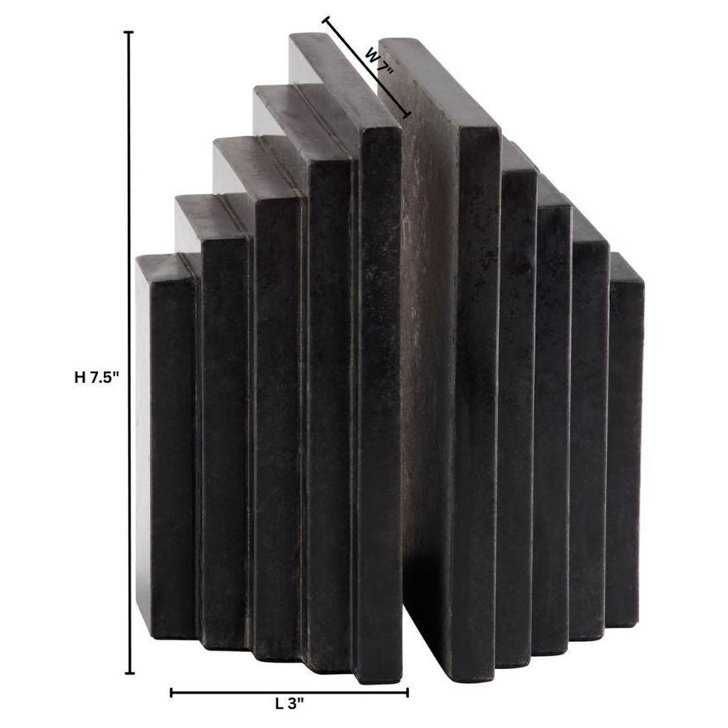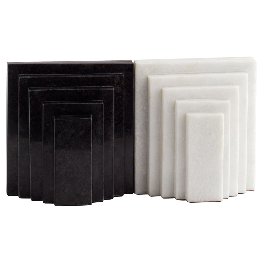 Five precisely cut, graduated black/white marble panels form the foundation of the Epilogue bookends, each progressively smaller than the last. This unique design creates a visually striking and harmonious composition, where mass and weight are utilized to firmly hold books of all sizes, both large and small. Crafted with an exquisite eye for detail and a keen understanding of balance, the Epilogue bookends redefine the art of organizing and displaying books.