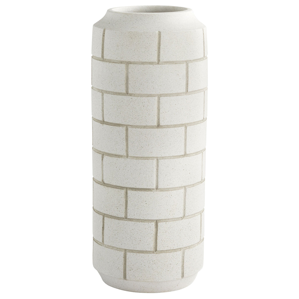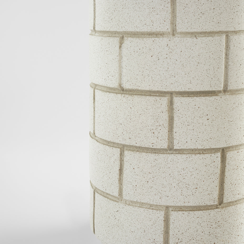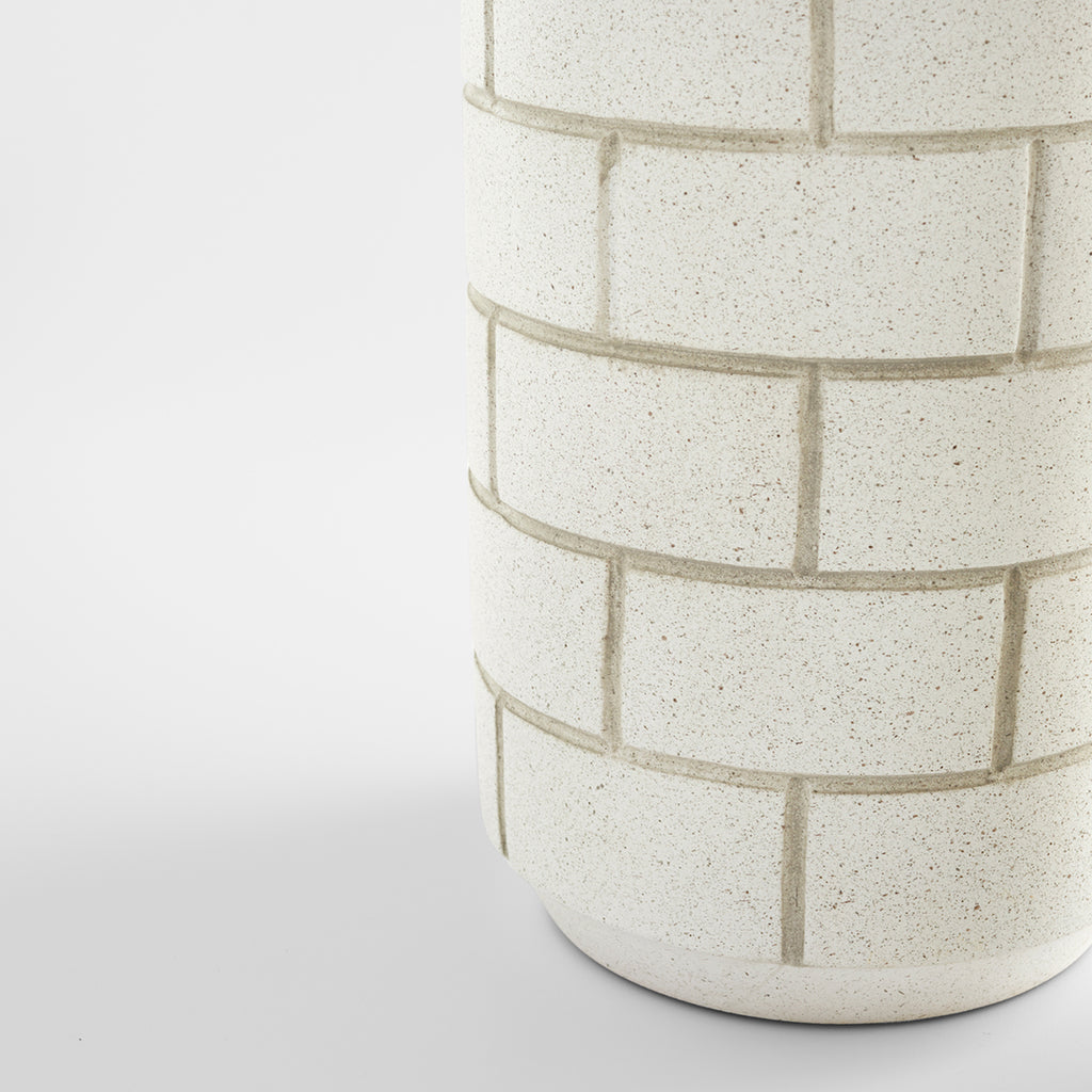 The distinct layed-brick pattern of the Mason vases gives the series of off-white speckled earthenware pieces its inspiration. Smooth cylindrical bodies are slightly tapered at base and rim, adding a touch of variance to balance crisp, perpendicular lines. Add a pop of geometric flair to any office space, washroom or kitchen with the Mase vase collection. Available in two sizes. Not water-tight.