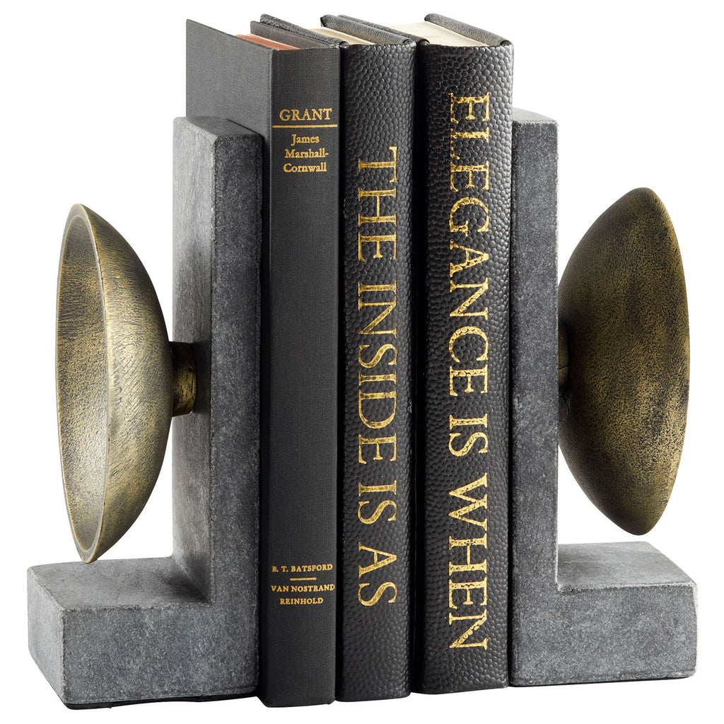 A veslana marble base braces antique brass finished concave disks in the Taal bookends. These bookends gained their namesake from small finger cymbals originating in the Indian subcontinent commonly used in music and performing arts. These whimsical bookends are functional and ornamental, making them an optimal addition to any bookshelf, side table, or console table. Antique brass-finished concave disks