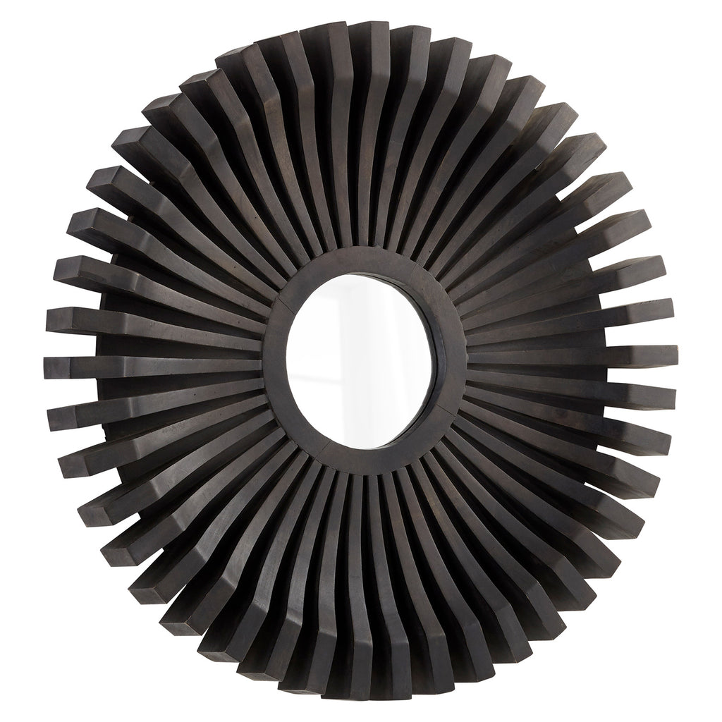 The Cyan Design Zon decorative wall mirror features a modern wooden frame in a Weathered Grey finish. This wooden mirror has accented tabs that are arranged side by side into one large circle with the reflective glass centered perfectly to provide absolute symmetry. This gorgeous mirror makes an impressive statement showcased in multiples or works just as well hung individually in any home or commercial space.
