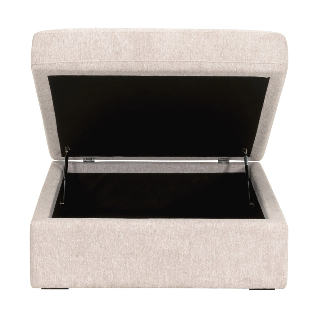 The Daley Modular Storage Ottoman by Essentials For Living combines transitional elegance with practicality. You can easily design a modular sofa that fits your space with the Daley Modular Armless and Corner Chairs paired with this ottoman or simply use it as a stand-alone piece. Its frame is meticulously crafted with wood materials and includes exposed wood feet in an espresso finish. The upholstery is made of performance LiveSmart Halifax ivory material that is not only eye-catching, but also practical. The fabric is treated with stain-resistant properties and composed of 100% polyester. The fixed seat cushion is filled with 50% down and 50% polyester foam, ensuring plush comfort. It features a storage compartment with a hydraulic hinged lid, providing a clever solution for keeping living spaces tidy. It measures 41" wide, 38" deep, and 19.5" high, and complete with undermount metal snap-style connectors.