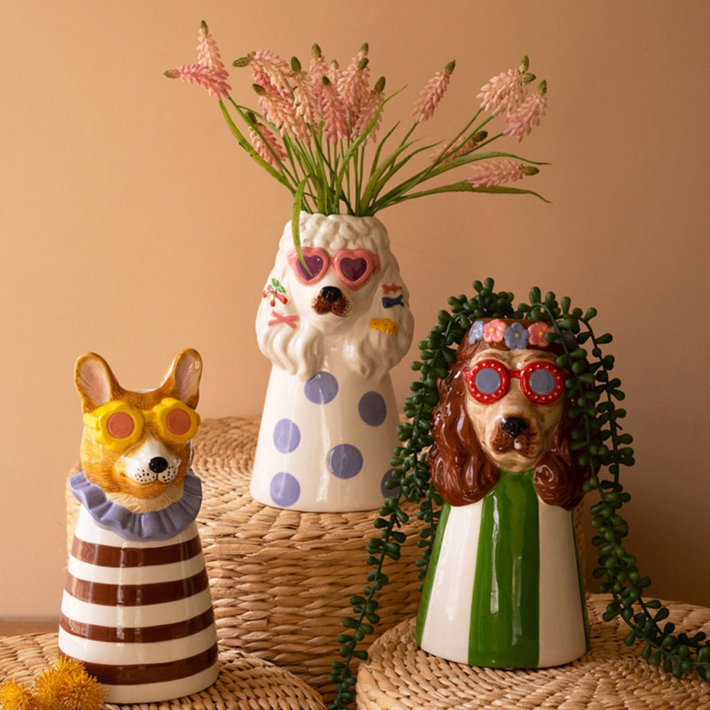 These sun-shaded pups are ready to brighten your day with their cool, laid back style. Each dog brings its own splash of color and personality, making your florals look instantly paw-some. Group them together for a trio that really brings the sunshine, or let them sit in their own favorite spots. Either way, they add a cheerful dose of doggone fun to your decor.
