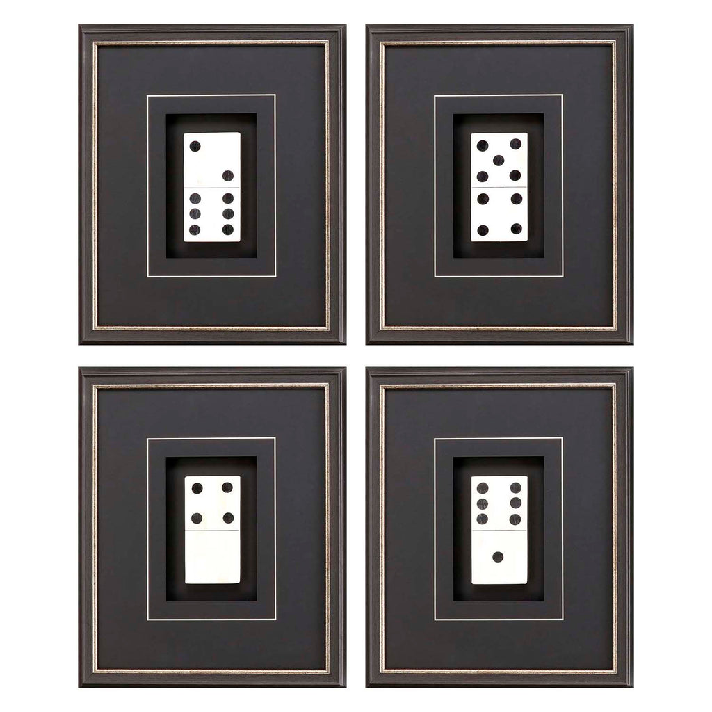 Domino pieces are matted in black. Framed in dark wood finish shadow box style molding with aged silver lip. Sold as set of four.