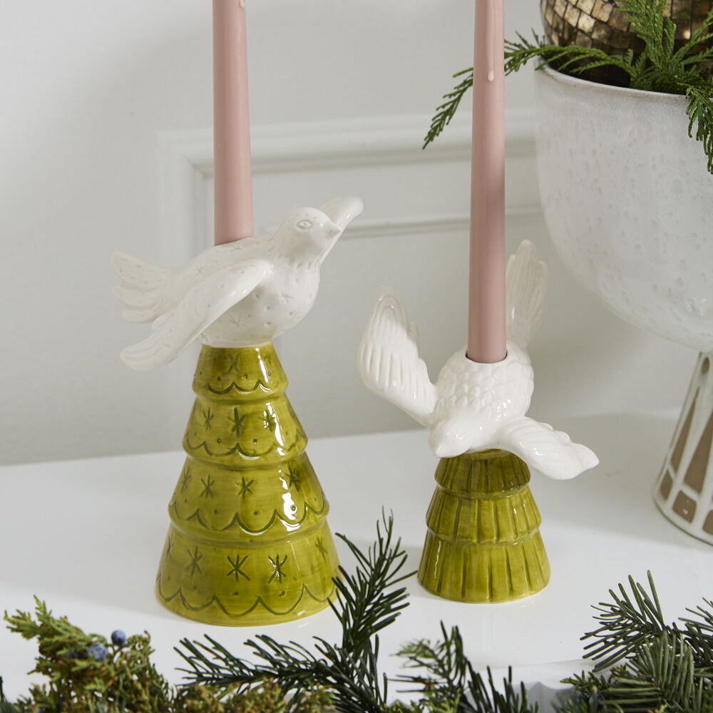 Bring a peaceful and vintage inspired look to holiday decor with the small Dove Tree Candleholder, a charming ceramic taper holder that features a white dove atop a painted green tree. With an all-over glossy finish and hand painted details, this bird can double duty as a decorative figurine as well as a functional candleholder for holiday hued tapers.