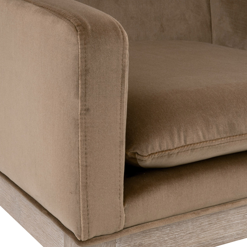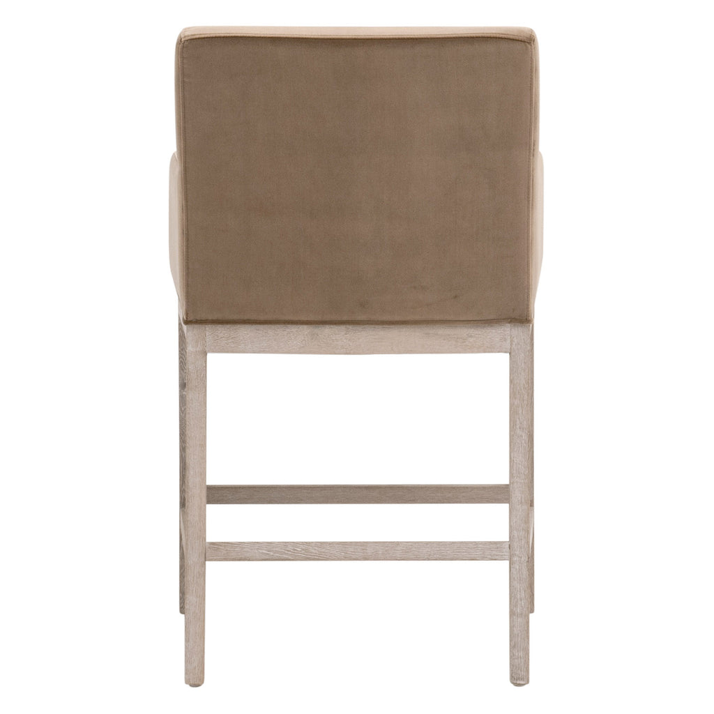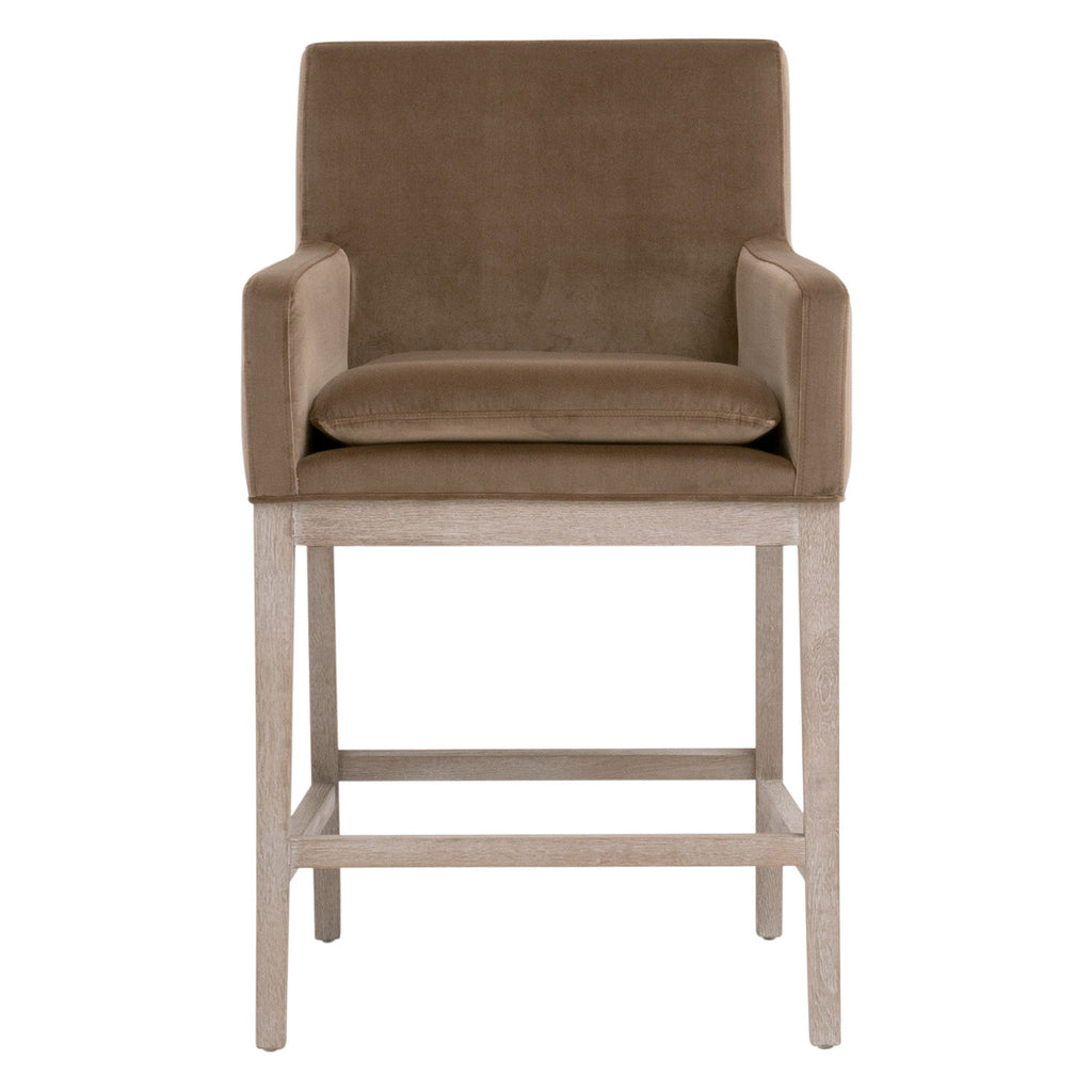 Made of smooth and luxurious velvet, this Drake Counter Stool by Essentials For Living is rich in color and high in versatility. The plush seat cushion is attached to the stool and features knife edging. The cushion is filled with high-density foam that makes this stool pleasantly comfortable for sitting. The solid wood base is constructed of solid oak with natural gray undertones, perfectly complementing the caramel velvet. Adaptable to many settings, this stool can be used for pub-style seating in a dining room, kitchen, or bar. It measures 24in wide, 24in deep, and 38.5in high, with a 27in seat height. Its transitional style, appealing tones, and ultra-cozy seat easily make this stool a great fit for any dining or bar space.