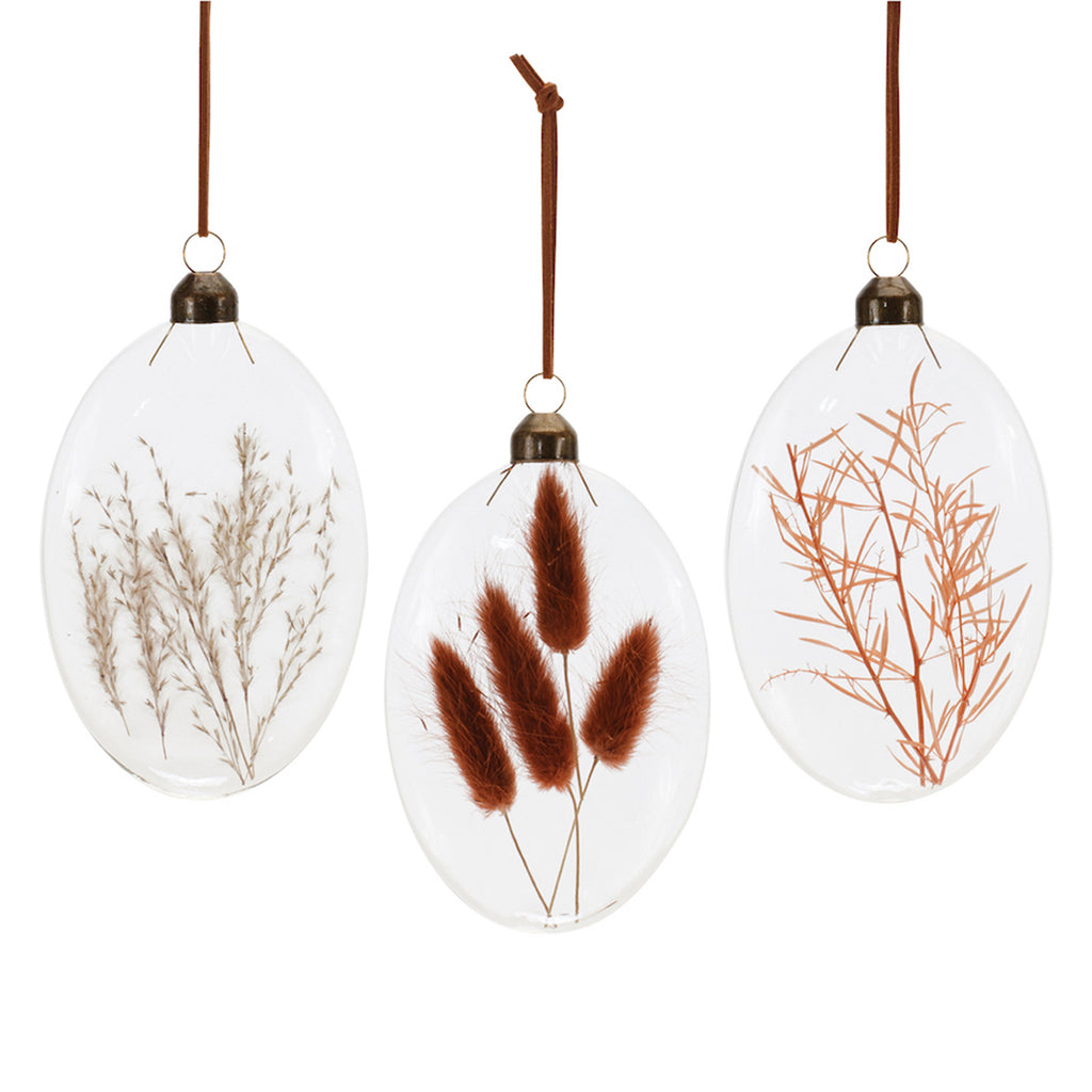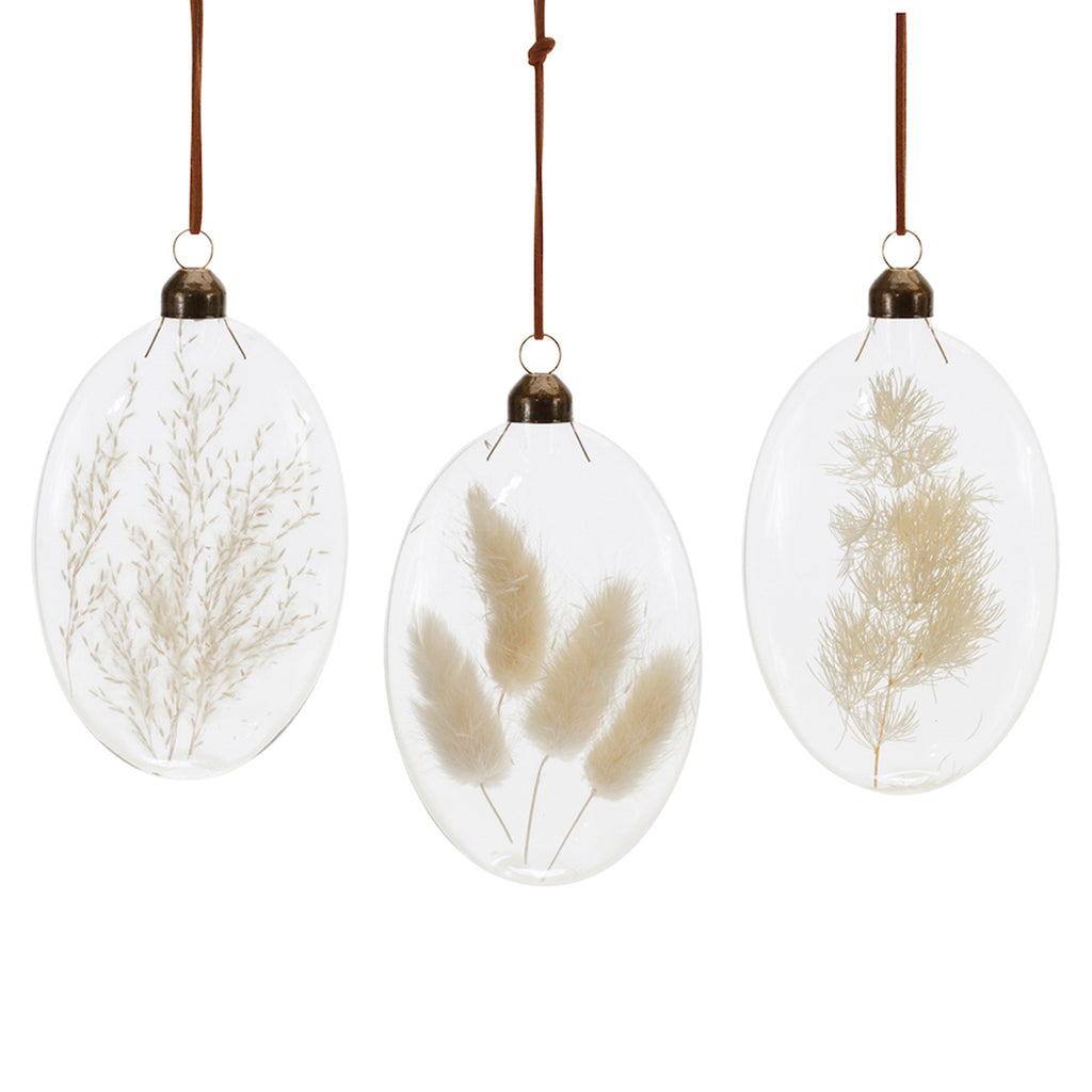 Add a natural modern touch to your Christmas tree with this stunning set of Dried Floral Globe Ornaments. Featuring 12 pieces and three assorted designs, the trendy dried floral grass design are the perfect combination to create a memorable dipslay. The quality glass composition with leather string hanger is sure to endure for seasons to come. Whether you're adding a touch of cheer to your home or gifting to a newlywed couple, these ornaments will definitely bring holiday spirit to your home.