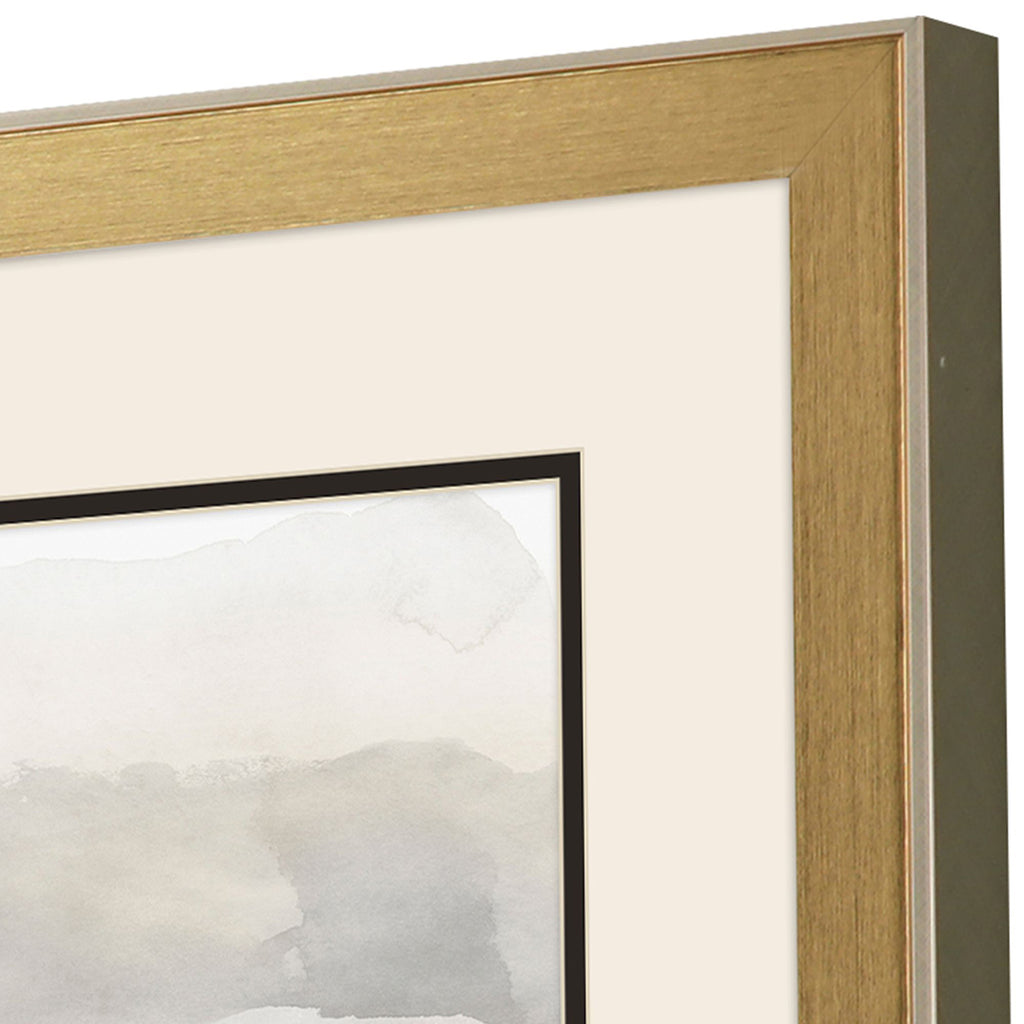 An abstract landscape in green and gray is matted in white. Framed in a modern gold finish moulding with champagne side and lip.