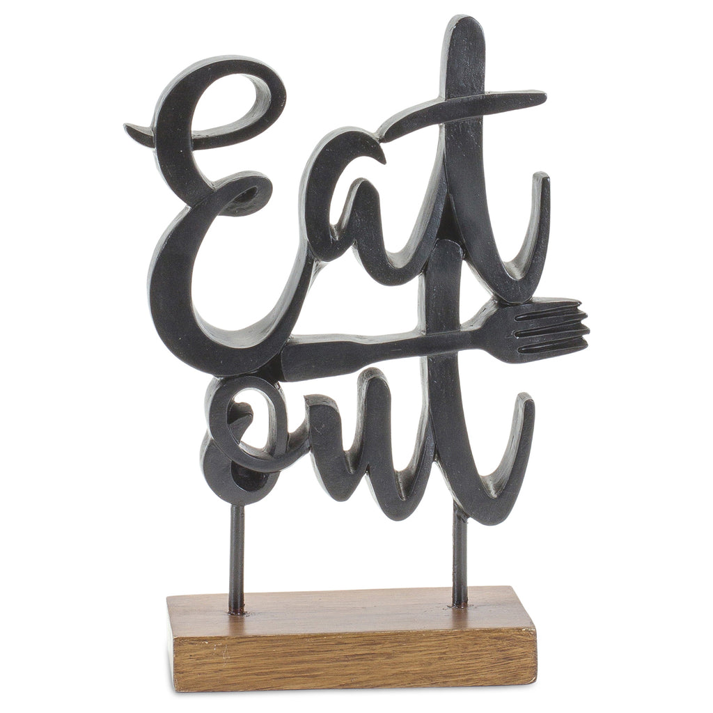 Welcome your guests in style with this beautiful Eat Out Table Sign. The classic black finish paired with the whimsical cut-out letters design and faux wooden accent is the perfect combination to create a trendy display. The quality polyresin composition is sure to last for seasons to come. Display the piece in your kitchen to add a touch of character to the space.