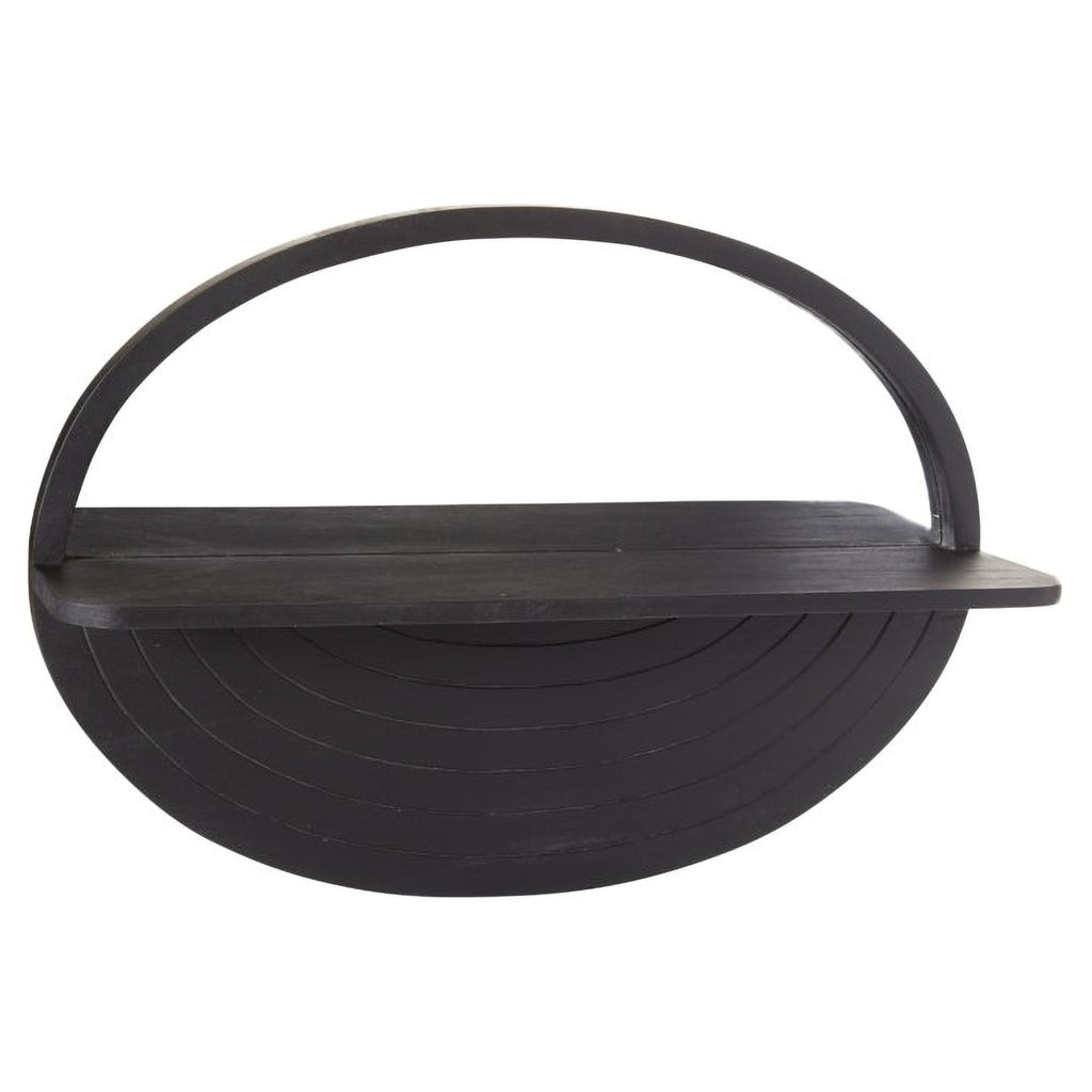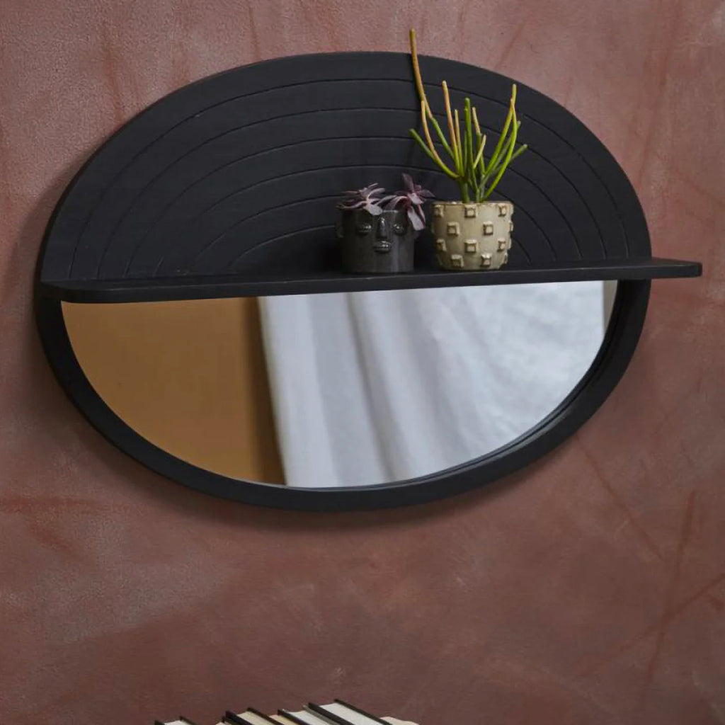 Create an expansive, grounded space with the stained black, mango wood Ebro Mirror. Featuring carved arches that add visual interest beneath a rectangular shelf, this oval decorative piece with its bold color & clean lines offers an easy interior design upgrade & storage option in an entryway or hallway. Pop a plant on the shelf or even bathroom towels. Mount on the wall with the two hanging points in back.