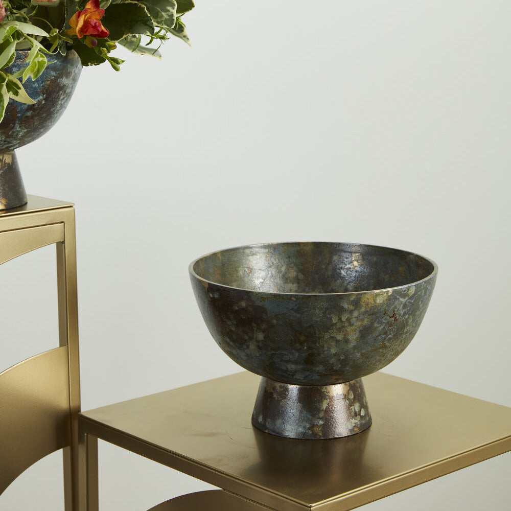 Bring sophistication, an old world sensibility, & a clean, modern shape to table settings with the bronze aluminum Edinburgh Compote. Variation in tone from warm gold to patina to charcoal creates an antique, oxidized look that makes a striking visual statement for wedding & event design. The interior fits a lush drop-in plant or accommodates a floral dish for large floral arrangements.
