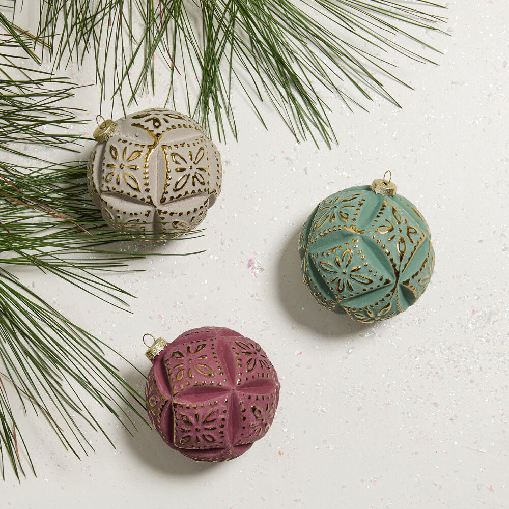 Add elegance and texture to the Christmas tree with the Embossed Velvet Ornament Collection. A diamond pattern with dimensional details creates a quilted look on each ornament, available in turquoise, raspberry, and taupe. Each of the colors has a metallic gold base that highlights the dimensional patterns.