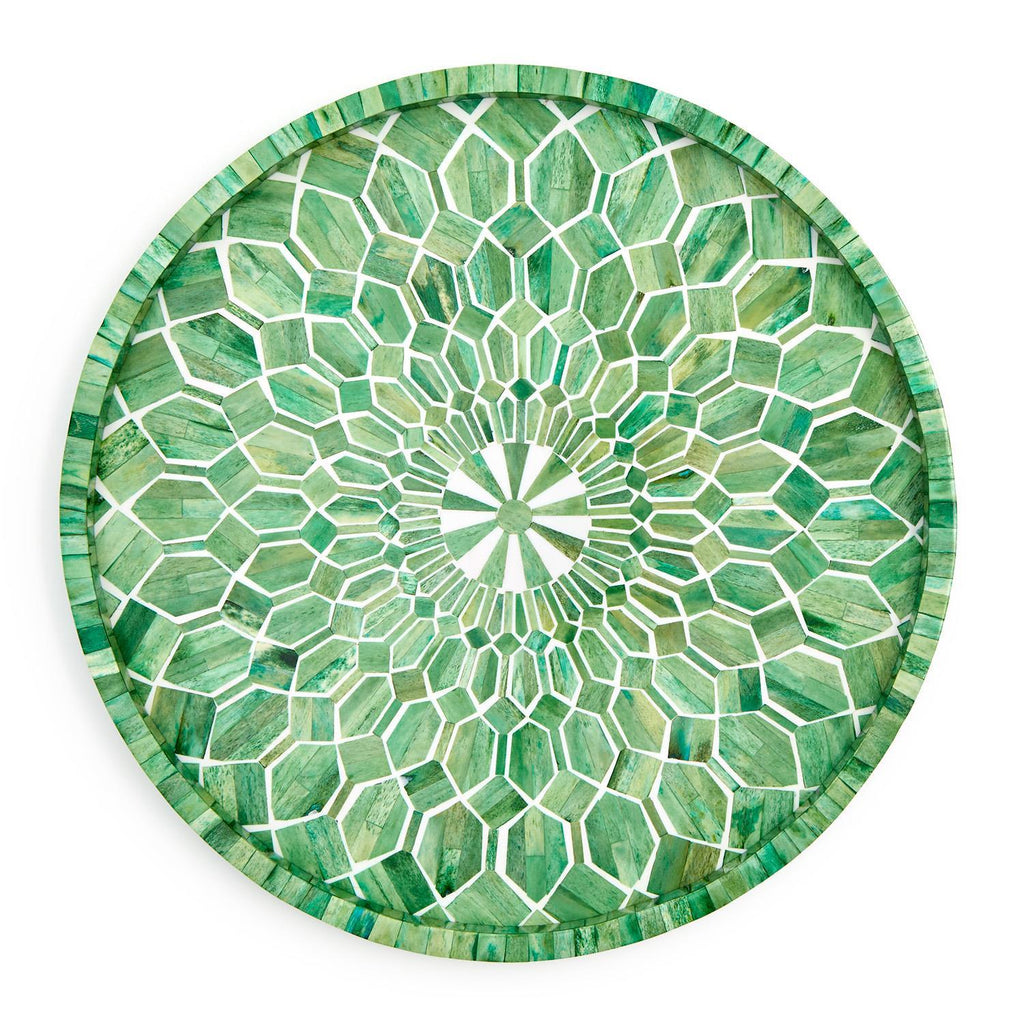 Elevate your hosting game with our Emerald Cut Hand Inlaid Decorative Round Serving Tray. Each tray is hand crafted from small pieces of bone dyed in a rich emerald greeen. Perfect for serving drinks or displaying your favorite dècor pieces, this piece adds a touch of elegance to any setting. Hand inlaid by skilled artisans, each tray is unique, showcasing intricate craftsmanship. Whether serving guests in your living room or as a statement piece in your kitchen, this tray is a must-have for those who appreciate beauty in every detail.