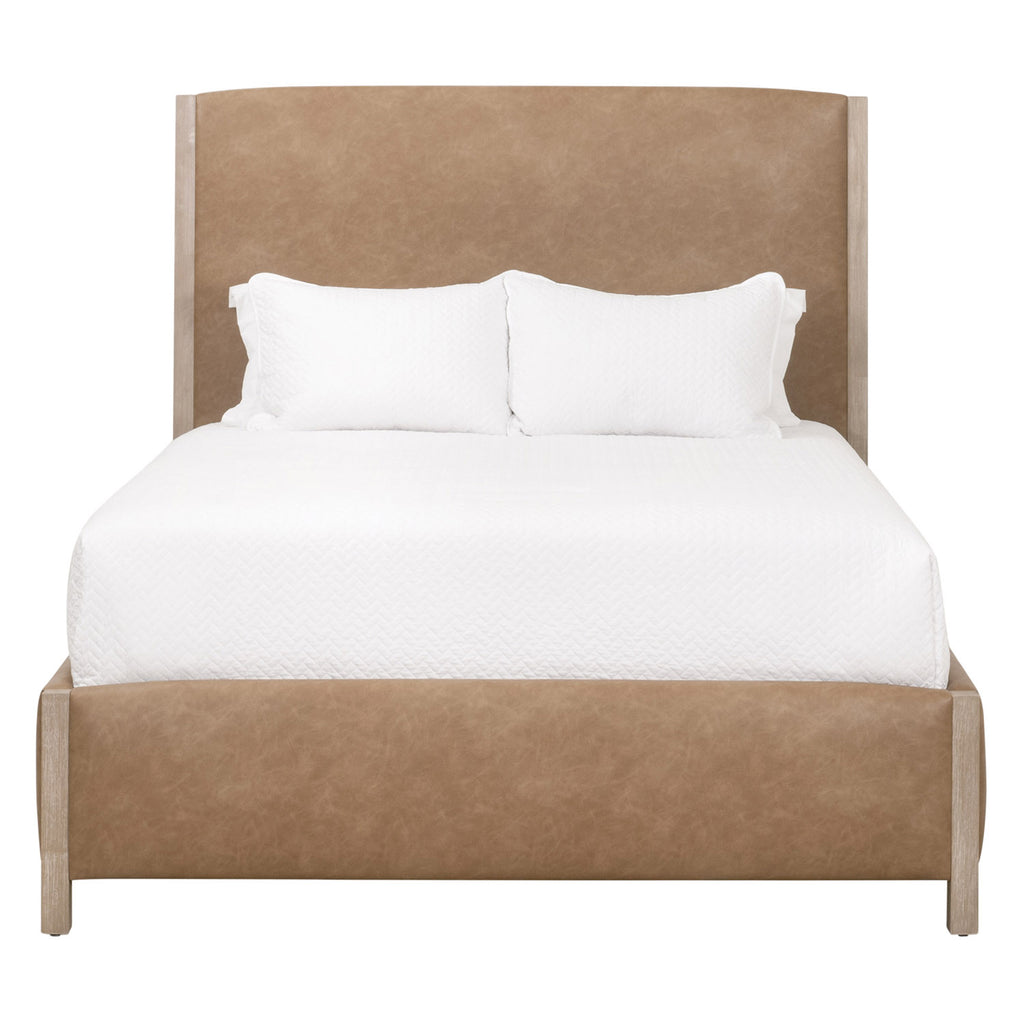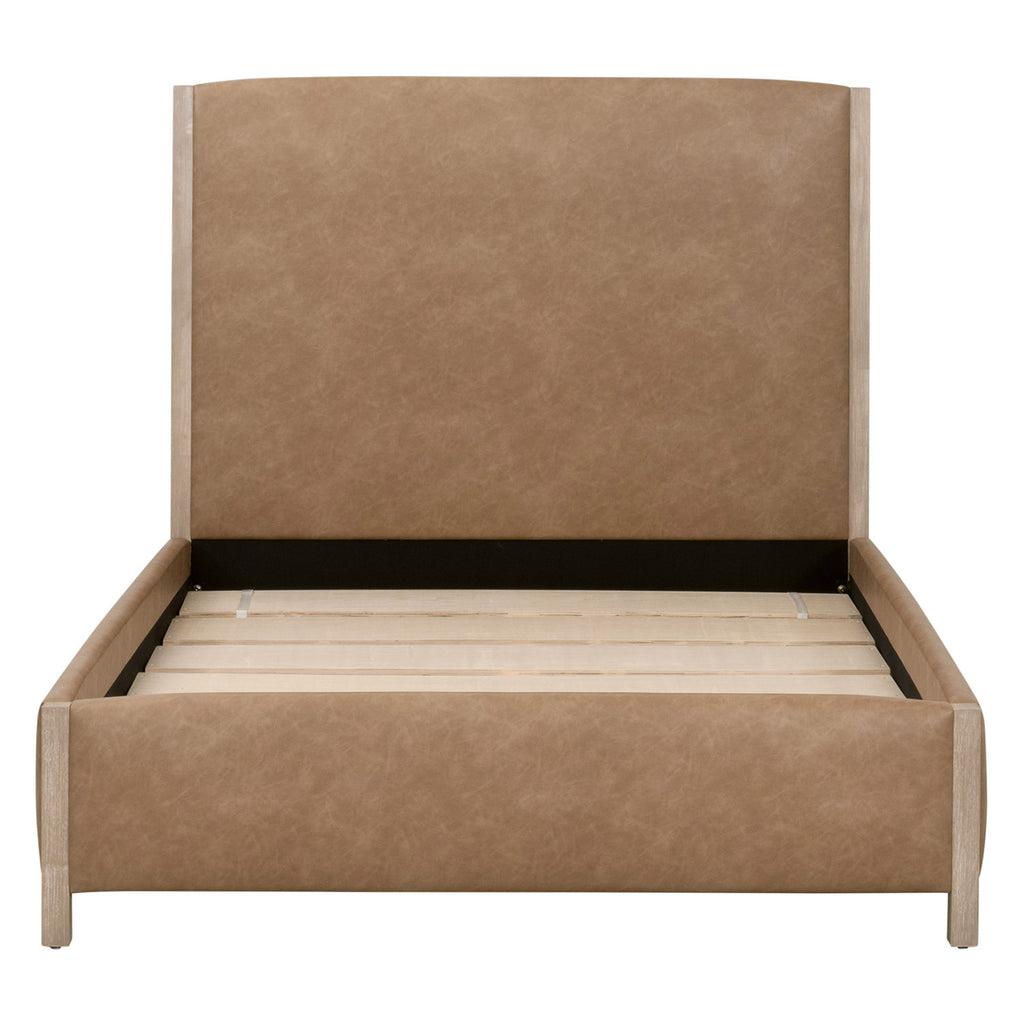 Experience the timeless elegance of the Emmett Bed by Essentials For Living. Boasting a transitional design, this bed seamlessly blends traditional and contemporary elements to elevate any bedroom decor. The frame, crafted from a combination of materials including solid rubberwood and solid beech wood, features a slightly distressed natural gray finish that complements the Ivanhoe Toast PU vegan leather upholstery. The soft and durable vegan leather not only offers durability and easy cleaning but also has a warm and sophisticated look. The headboard, footboard, and side rails are fully upholstered, drawing the eye to the exposed wood legs. It also features an extra-wide engineered wood slat foundation to ensure robust support for a restful night's sleep. With its solid wood, post-style legs and impeccable quality, this bed is a statement piece that promises both style and longevity.