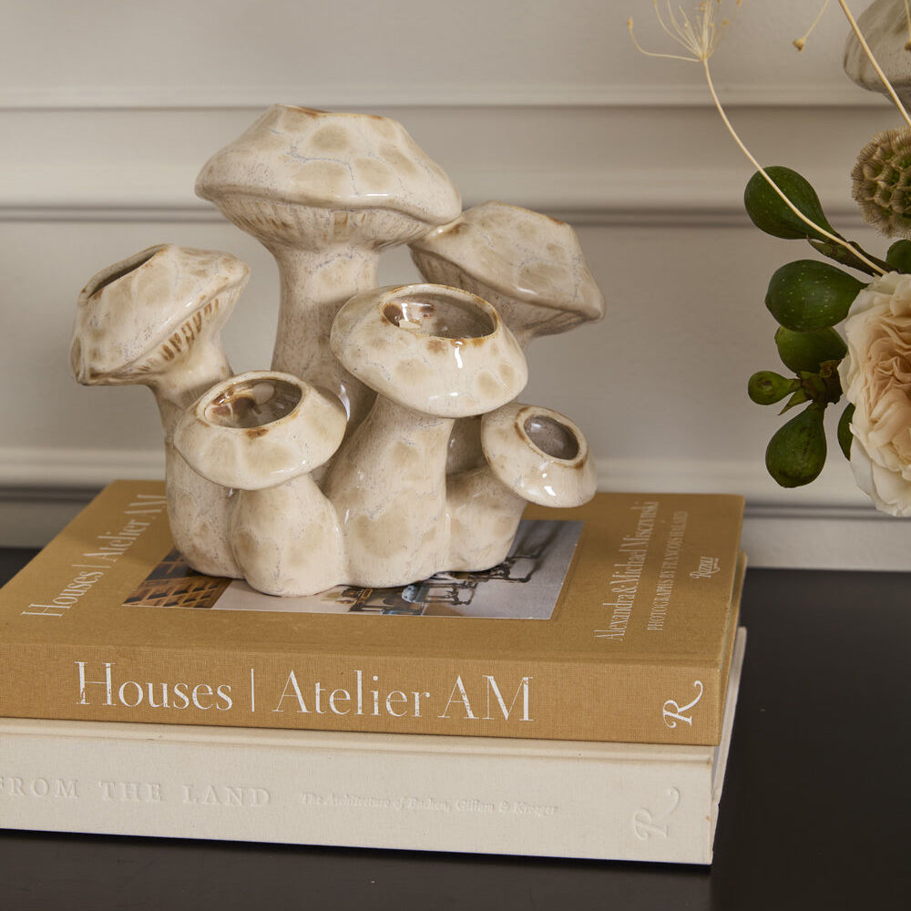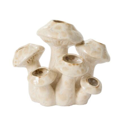 The large Enoki Mushroom Vase features a stunning reactive glaze in soft shades of white and light tan, adding a natural, organic feel to any space. Each of the 6 mushrooms includes an opening, making them perfect for styling with florals or as a standalone sculptural piece. However they are styled, these mushrooms bring a touch of earthy elegance to your home.