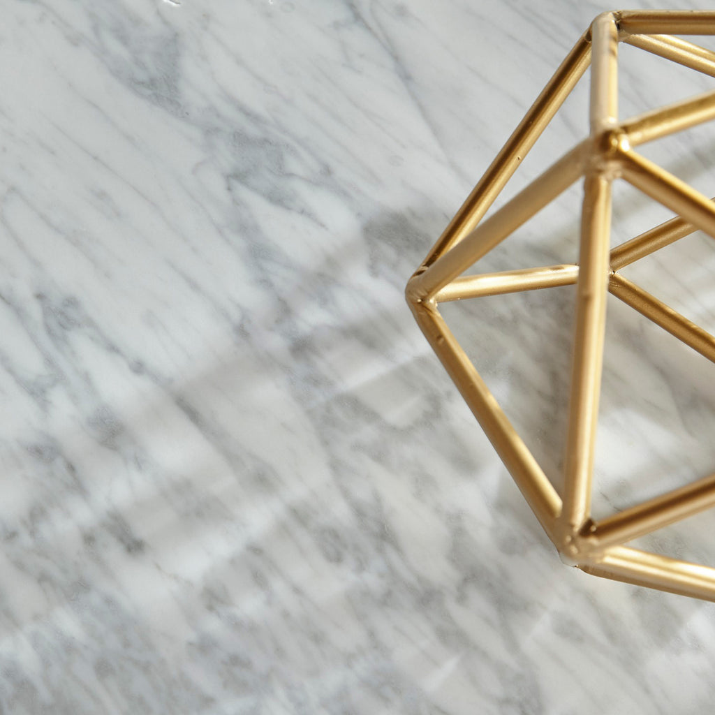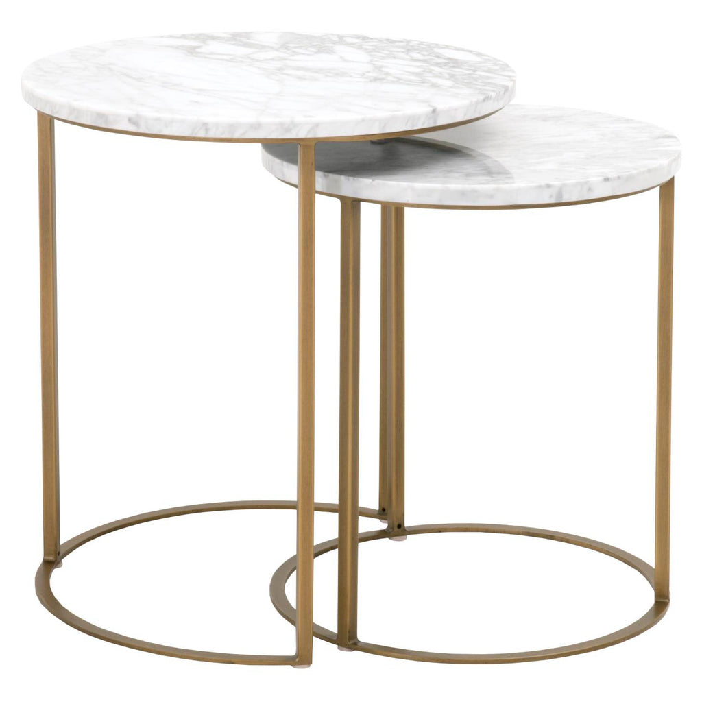 The Essentials for Living Carrera round nesting accent tables in contemporary style featuring brushed gold base and white carrera marble top. Sold as set of 2.