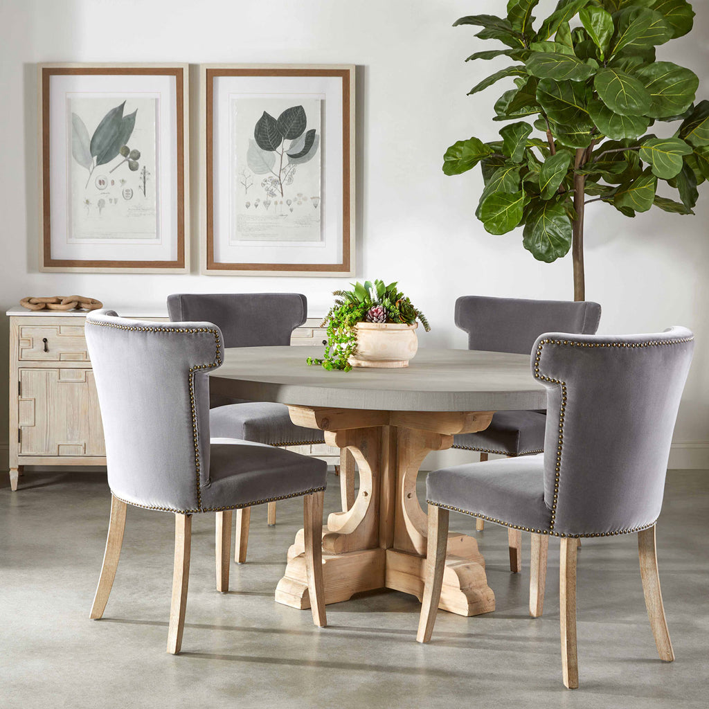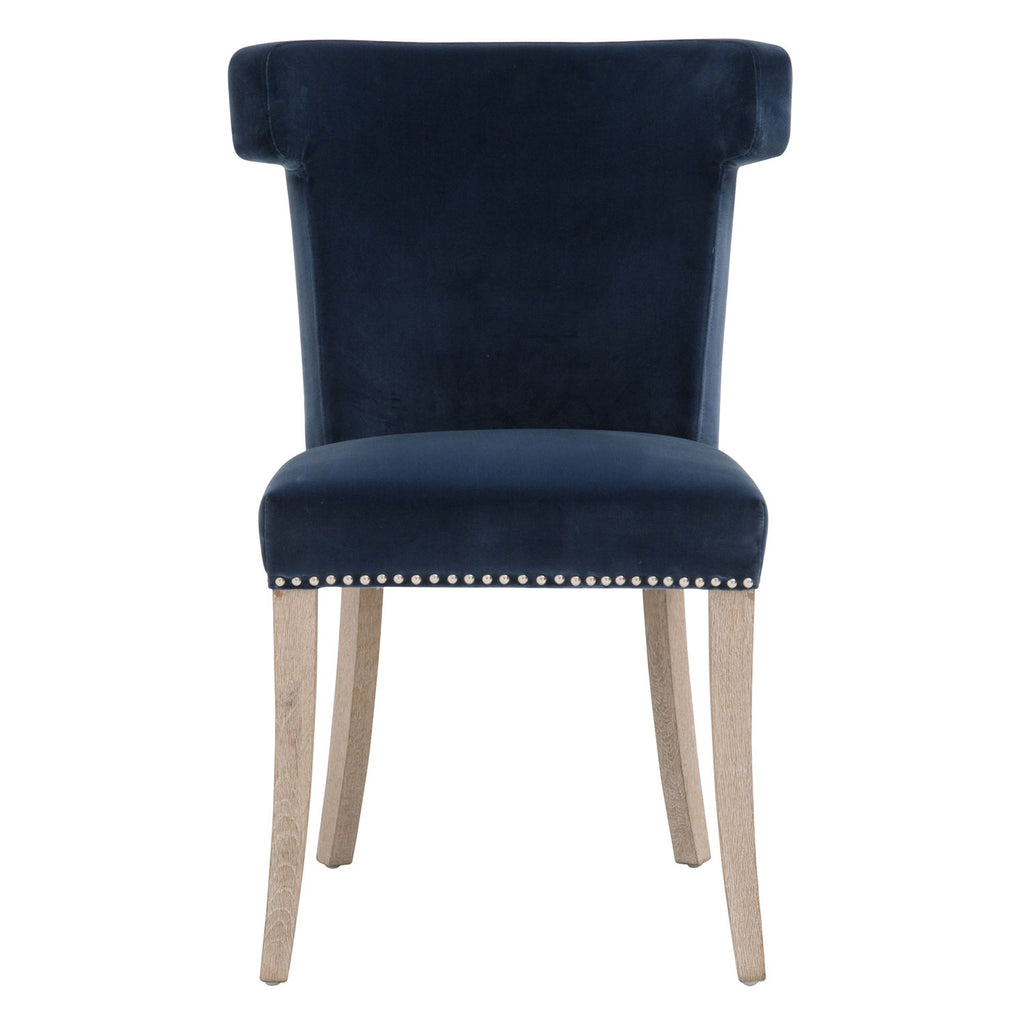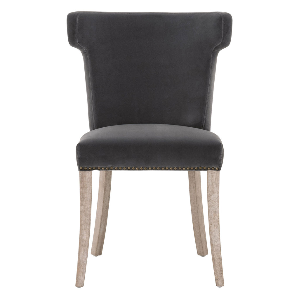 Complete your dining set with the elegant Celina velvet dining chairs. The smooth velvet upholstery is rich in color and will make these chairs the stand-out piece of your dining set. It is constructed with a uniquely sculpted wingback and natural gray oak legs. Gold nail heads line the base of the seat and back of the chair, adding modern appeal to this beautiful dining chair. These side chairs will pair nicely with many transitional style dining tables.