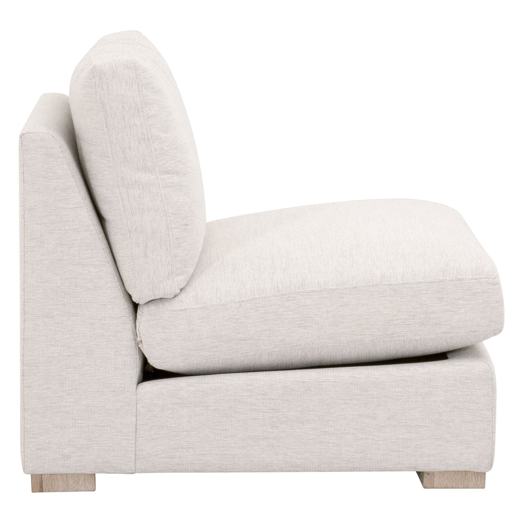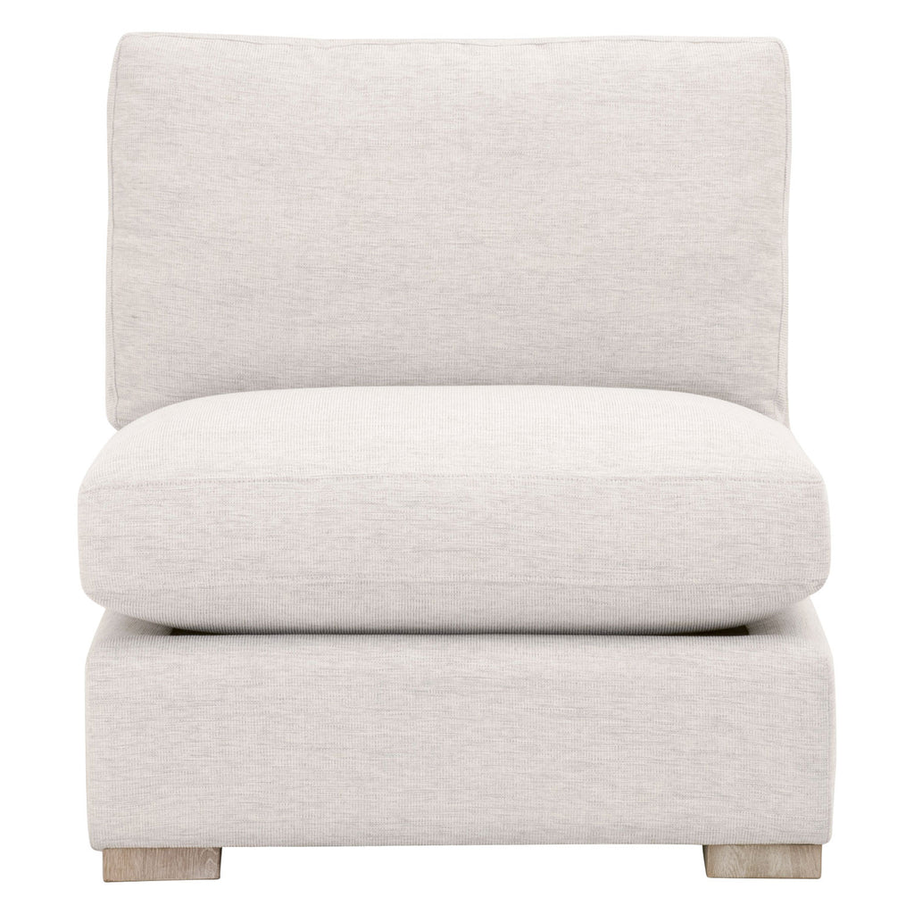 This armless chair is one piece of a beautiful modular sofa set. Each piece is sold individually, so you can design a sofa that will best fit your space. It is constructed with an 8-way hand tied suspension and upholstered with stain-resistant treated fabric. The seat and back cushions are reversible, removable, and filled with a down/polyester blend, making them easy to re-fluff and flip to the other side. The gorgeous upholstery is a perfect weave of light gray and white threading with a slightly textured look and feel. The soft and inviting colors of the fabric paired with the natural gray oak feet will compliment many rooms and design styles. Each piece of the modular set contains metal undermounts that snap together to connect each piece to prevent movement and gaps. Alternatively, this armless chair could also work as a stand-alone seat.