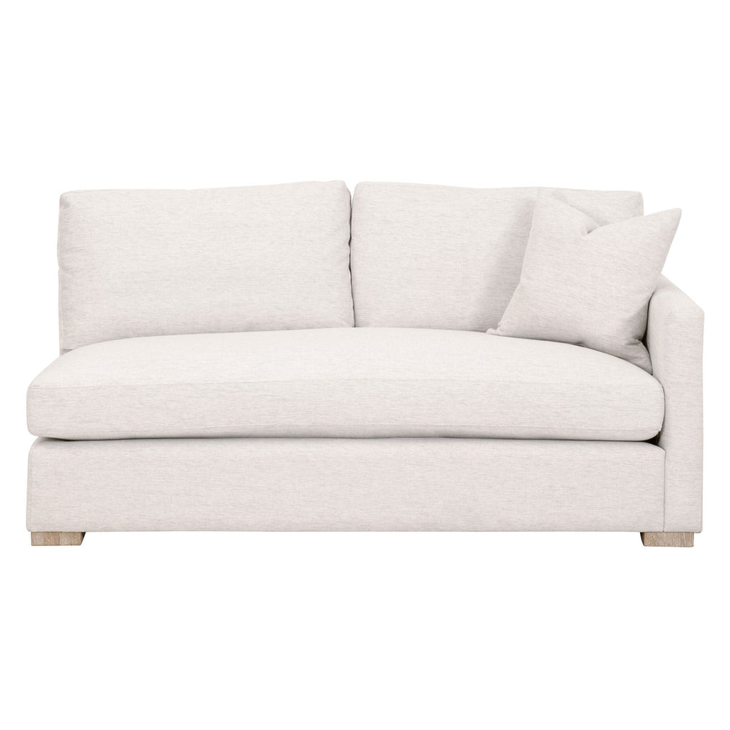 The Essentials for Living Clara 2-seater right arm sofa seat is one piece of a beautiful modular sofa. Each piece is sold individually, so you can design a sofa that will best fit your space. It is constructed with an 8-way hand tied suspension and upholstered with stain-resistant treated fabric. The seat and back cushions are reversible, removable, and filled with a down/polyester blend, making them easy to re-fluff and flip to the other side. It also includes one throw pillow filled with 100% down. The gorgeous upholstery is a perfect weave of light gray and white threading with a slightly textured look and feel. The soft and inviting colors of the fabric paired with the natural gray oak feet will compliment many rooms and design styles. Each piece of the modular set contains metal undermounts that snap together to connect each piece to prevent movement and gaps.
