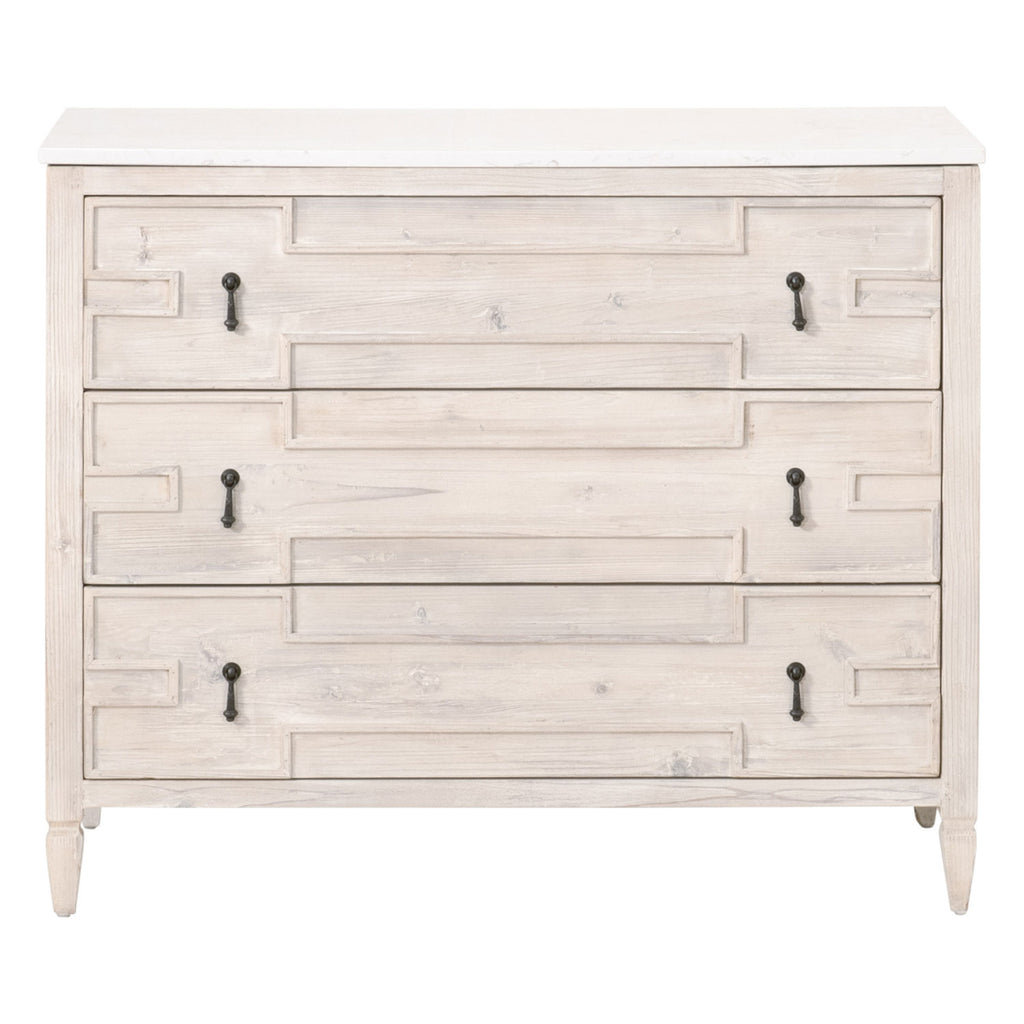 The exquisite Essentials for Living Emerie quartz-topped entry cabinet can also function as a dresser, side cabinet, or media stand. It is constructed with a solid quartz top designed to resemble white and gray marble and a solid wood base with a white-wash finish. It features three large storage drawers, allowing ample storage space within this transitional-style cabinet. This would make a beautiful addition to any living room, bedroom or foyer. Bella Antique Collection products are made with natural stone, antiqued metal, concrete, and reclaimed wood. These products include unavoidable variation in color, texture, uneven grain, blemishes, scratches, marks, and cracks. These features are not defects, but rather the material's natural characteristics.