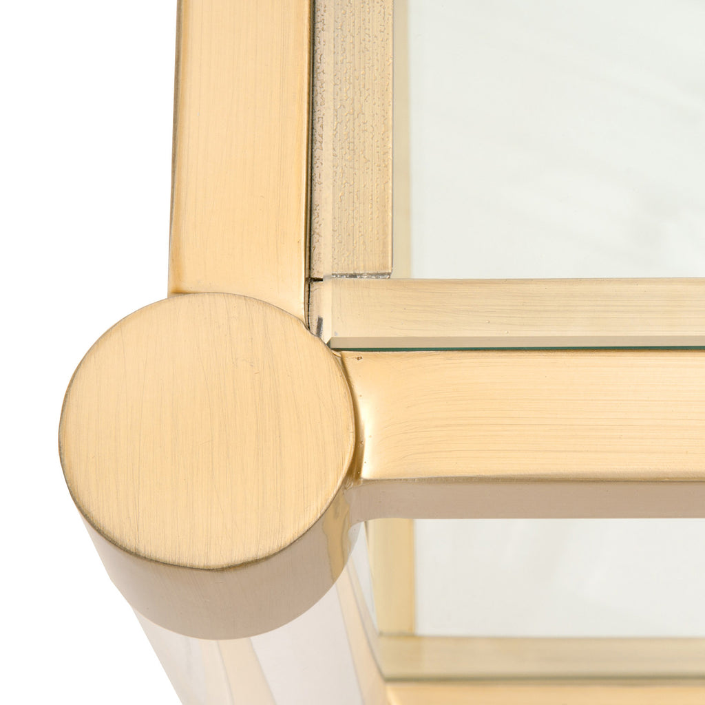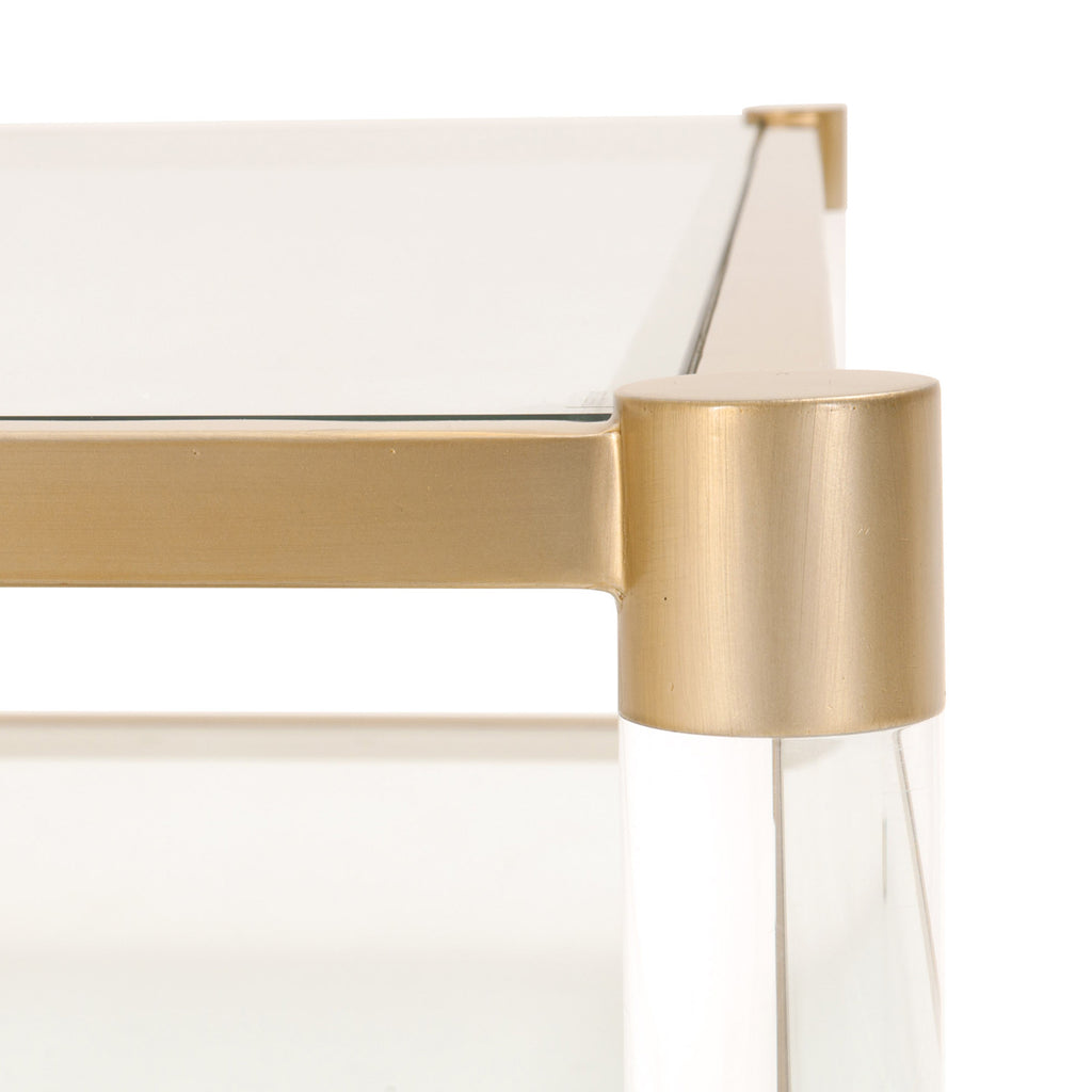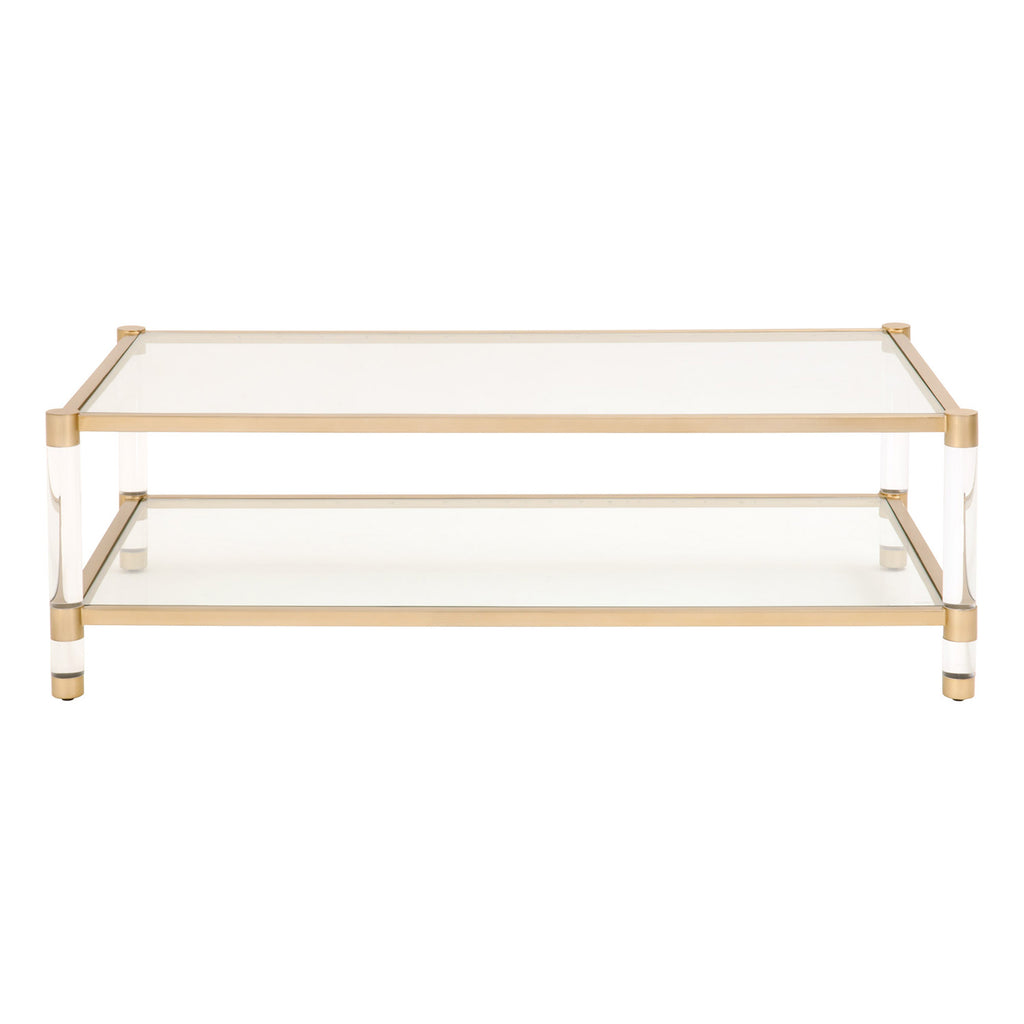 The Nouveau transitional style coffee table featuring a tempered glass top and shelf with a stainless steel frame and clear acrylic legs.