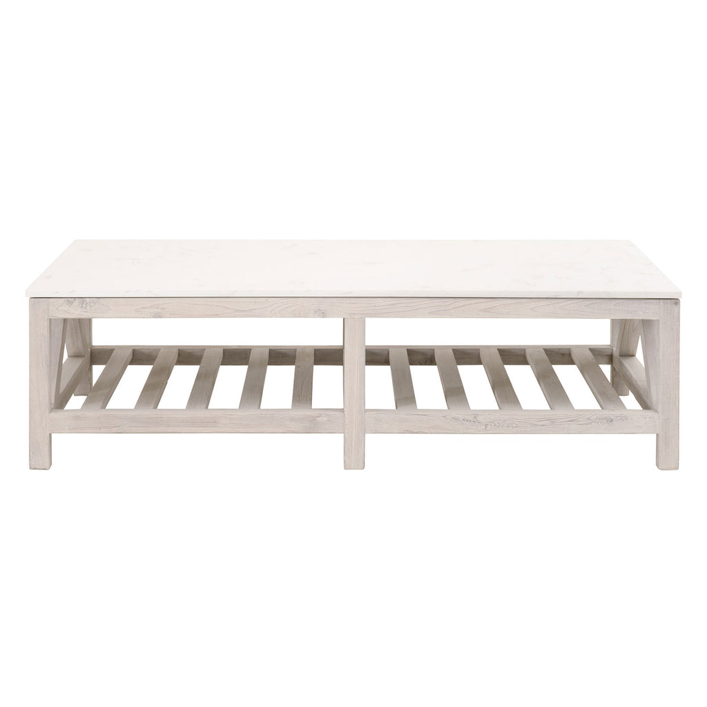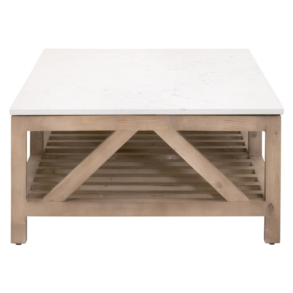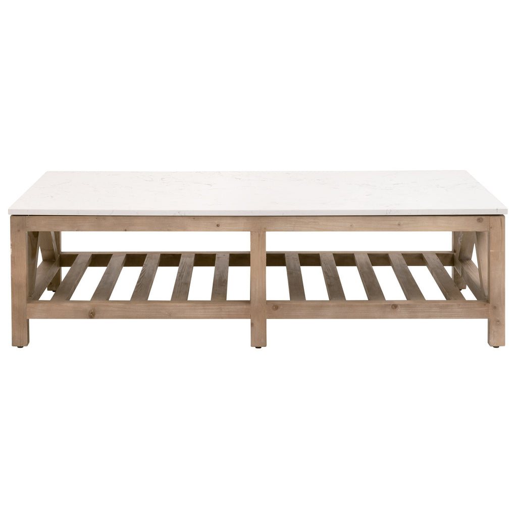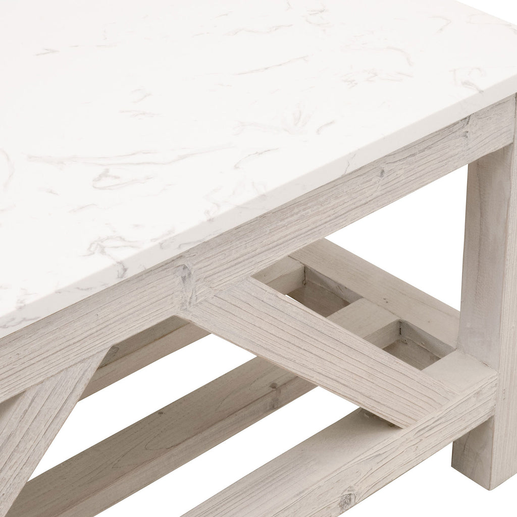 The stunning Essentials for Living Spruce quartz-topped coffee table is an eye-catching transitional piece with a touch of farmhouse style. It is constructed with a solid quartz top designed to resemble white and gray marble and a solid wood base with a white-wash finish. The trestle base with gray wood grain adds rustic charm to this modern-looking table. Its light color palette and simple design will pair nicely with many different colors and transitional or farmhouse furniture pieces. Bella Antique Collection products are made with natural stone, antiqued metal, concrete, and reclaimed wood. These products include unavoidable variation in color, texture, uneven grain, blemishes, scratches, marks, and cracks. These features are not defects, but rather the material's natural characteristics.