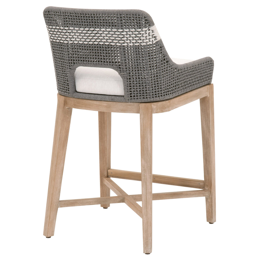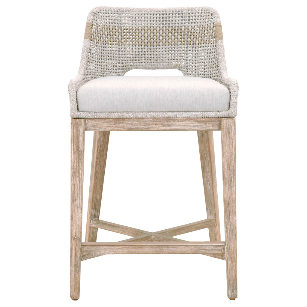 Transitional style counter stool featuring solid Mahogany frame and interwoven White Flat Rope design.