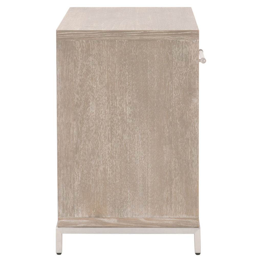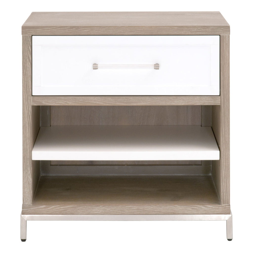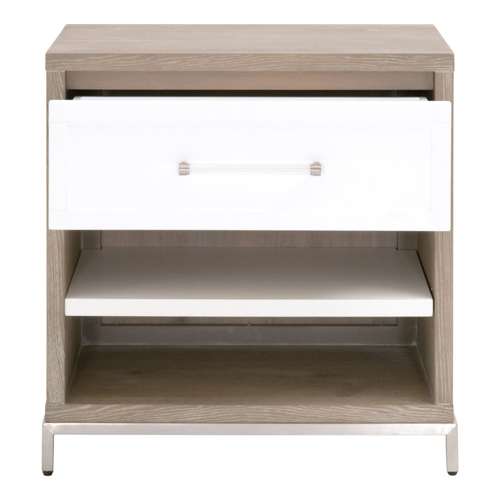 The Wrenn transitional style nightstand featuring contrasting colors and decorative hardware. The drawer uses full extension metal glides, and the shelf is adjustable below. Tradition Collection's Acacia Veneer finish is sandblasted to create a rustic appearance. This process accentuates the natural grain of the wood and creates a variation in both color and texture. The existence of natural knots, cracks, scratches, and marks in the surface of the wood should be expected.