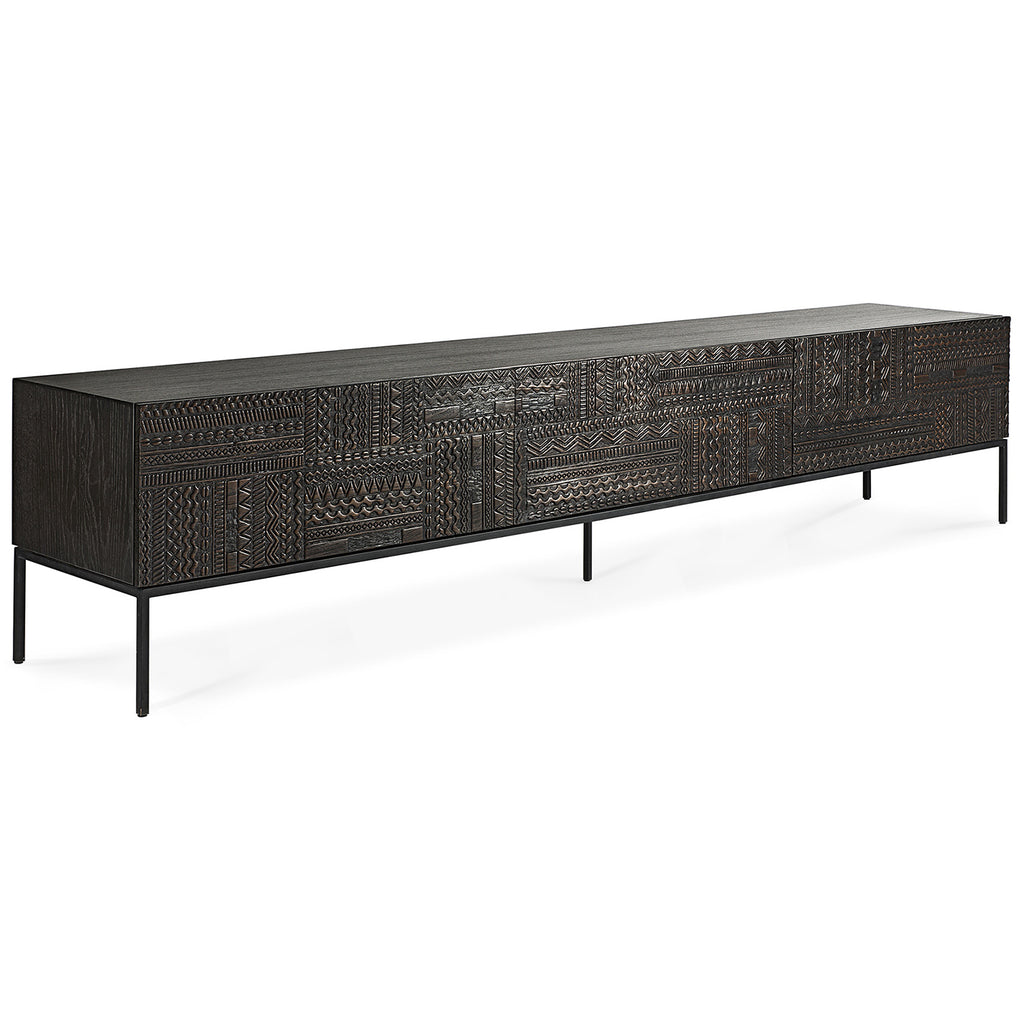 • Solid teak doors with a varnish finish, oak veneer body and black metal legs.