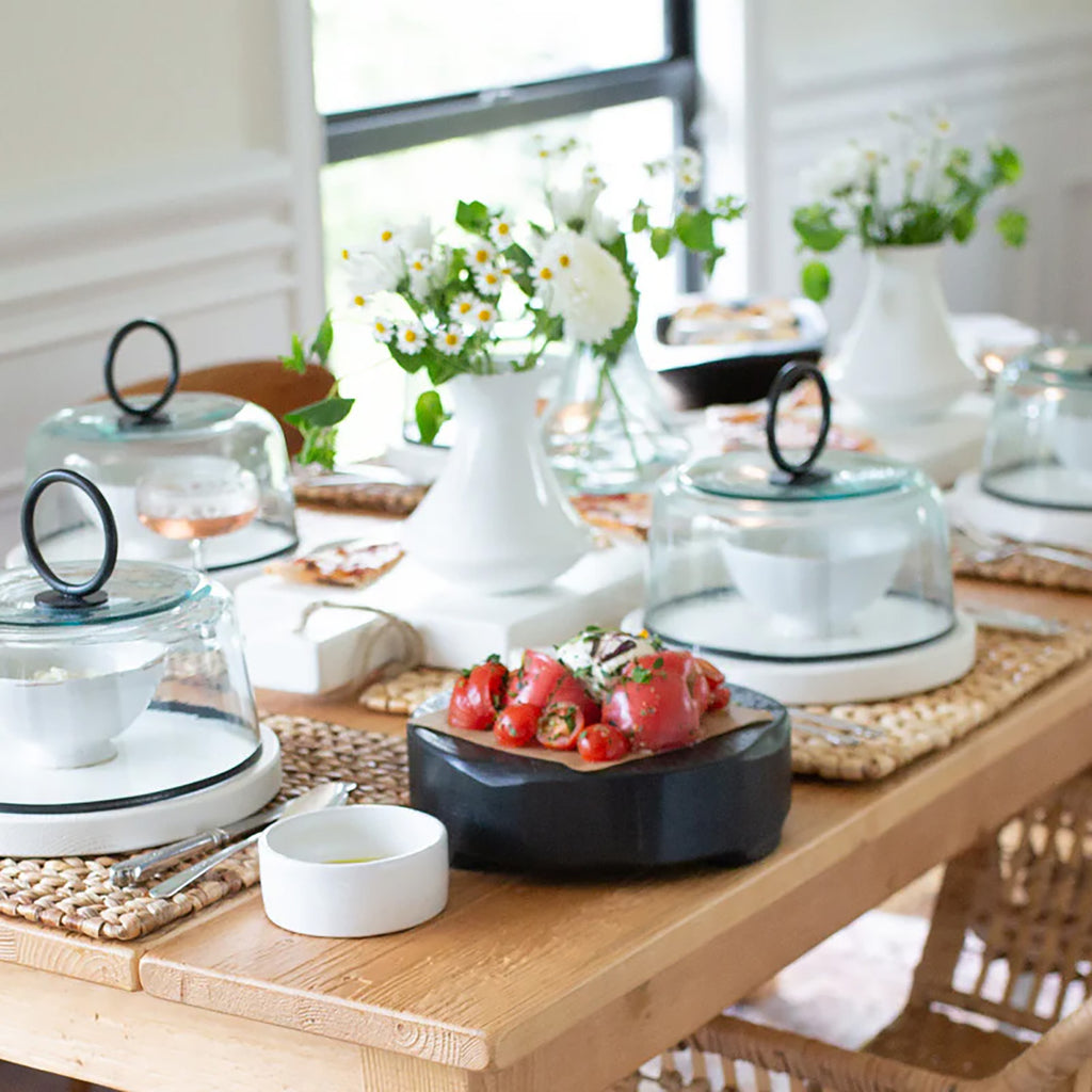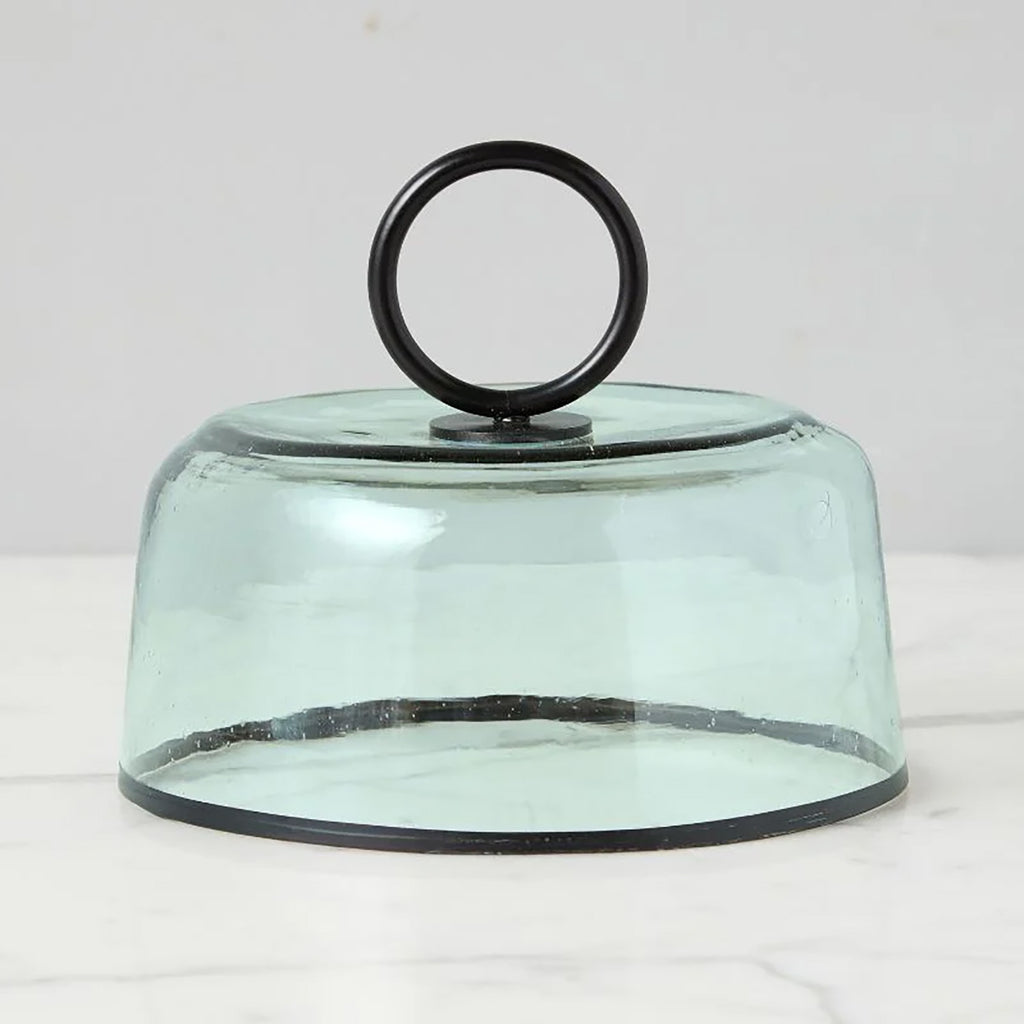 The distinctive shape of the Etu Home Barcelona Glass Dome is created by using the bottom half of a large recycled glass demijohn bottle. The dome is then paired with a raw iron ring handle. This decorative accent is perfect in its practical use as a fruit, cheese or bread cloche, or simply as a table accent. Pair the glass dome with serveware pieces like cake stands, serving trays and trivets for a large array of styles and arrangements.