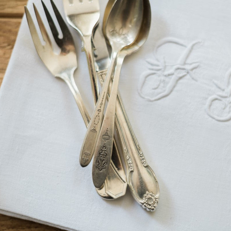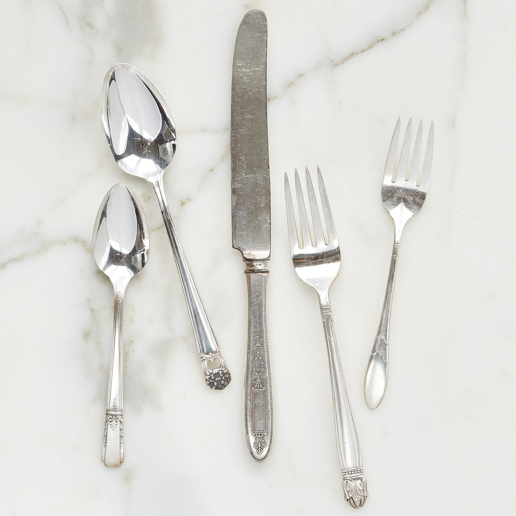 Family gatherings are made even more special with our silver plate 5-piece setting. The beautifully proportioned and artfully balanced collection is a hallmark of its creators. Bring an authentic vintage touch to your well-dressed table. Each flatware set is mix and match for a unique and unpredictable look. Due to the found nature of this item, each piece of silverware will differ in size, coloring, pattern, and look. This is sold in a set of 5, including a dinner knife and fork, salad/dessert fork, tablespoon, and teaspoon.