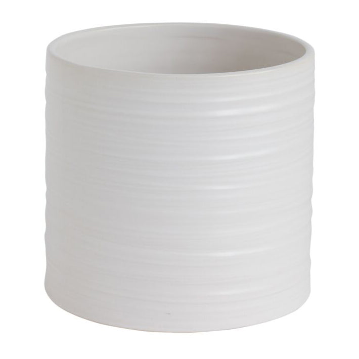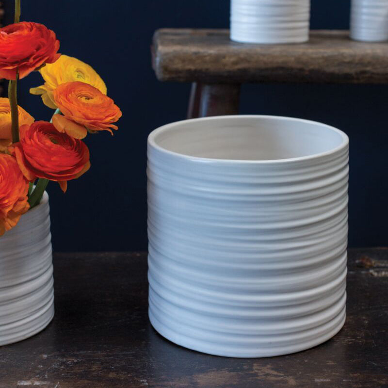 Simple striated ceramic pot in a matte white glaze, modern and perfect for home decor or florals.