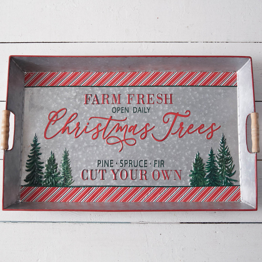 Display wrapped holiday treats and trinkets on this Farm Fresh Christmas Trees Tray. Ideal for holiday parties, this tray will be the center of attention when guests gather. Tray is not food safe. Use with a doily or liner.
