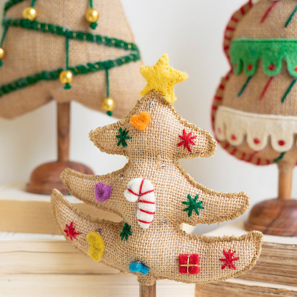 These festive trees set the merry mood. This set of six decorated felt trees is made for propping on shelves or tables or letting the grandkids arrange. Add felt touches to your holiday village or wintry scene with these trees.