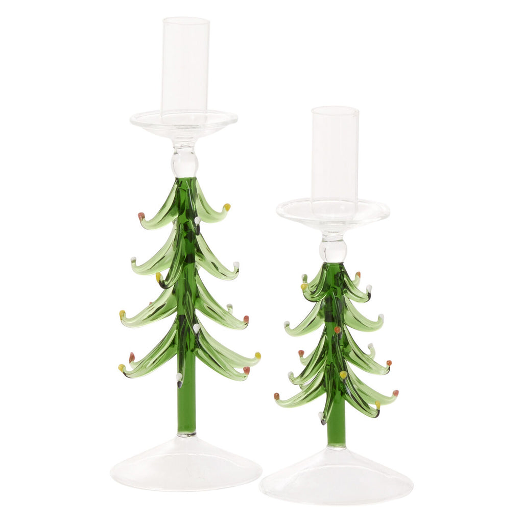 Capture the beauty and whimsy of the holidays with the Fir Tree Candleholder, a hand-crafted borosilicate glass taper holder with green branches and multicolor ornaments for a stem. A clear, circular base supports this tiny tree, and a clear cylinder opening with a wax catching plate sits on top. Available in 2 heights, each unique piece can be styled along a holiday table to create a dreamy decorative forest topped with a warm winter glow.