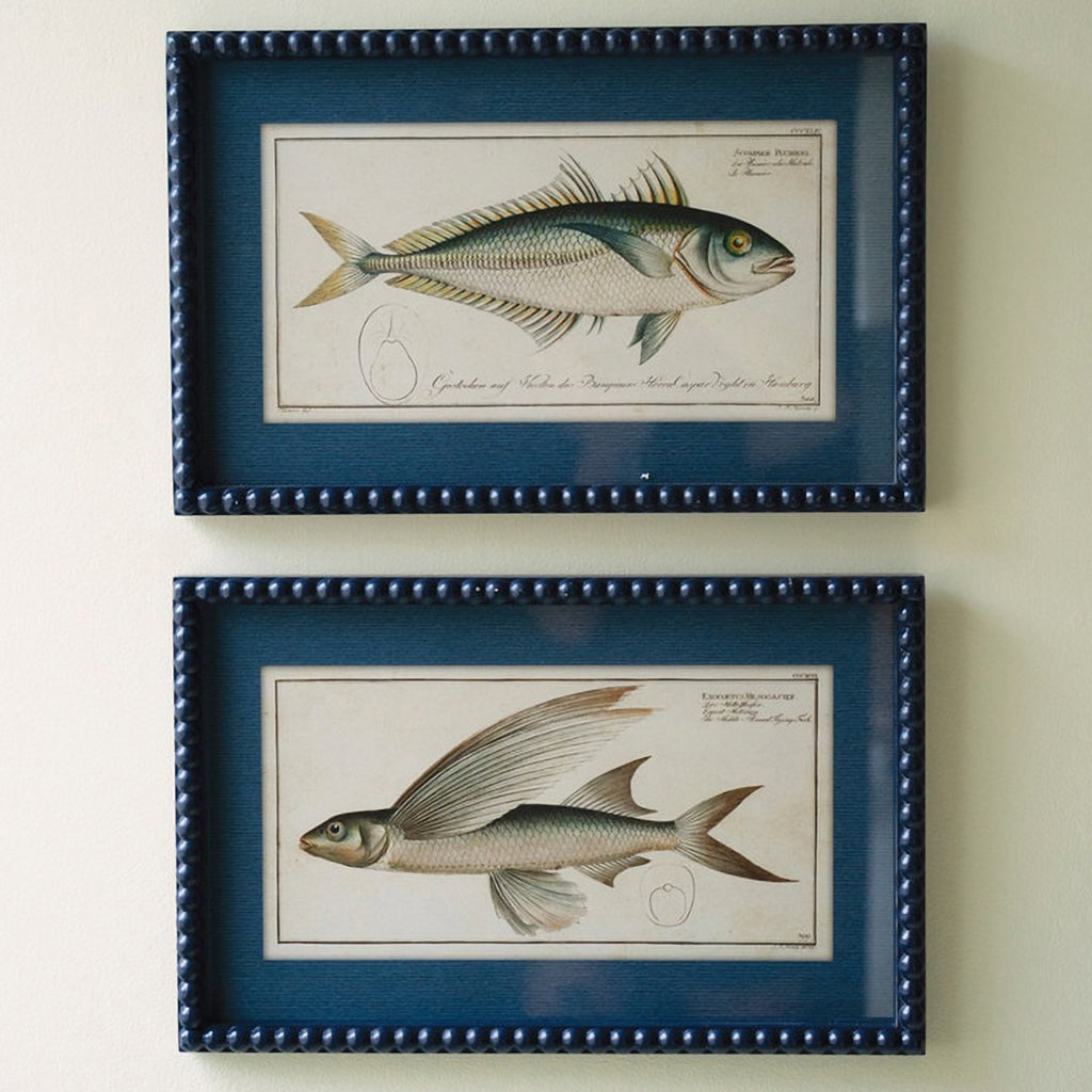 Deck the walls of the fishing cabin with this set of two navy-framed fish prints under glass. Enjoy at the lake or any fisherman's space. These prints go swimmingly with other themed elements.